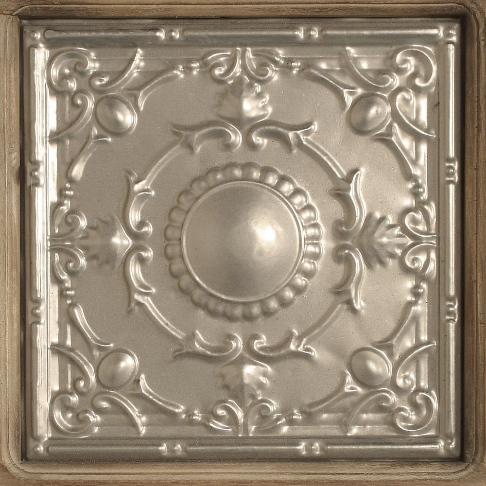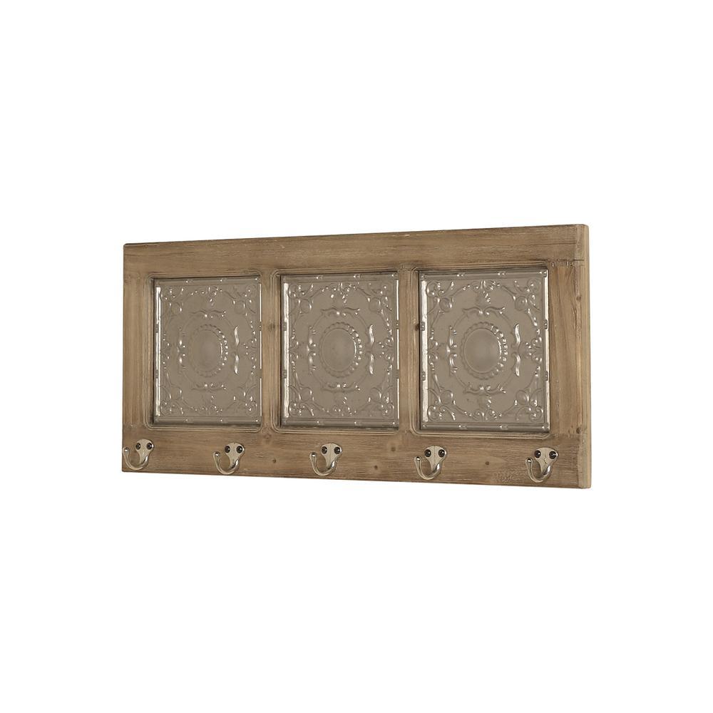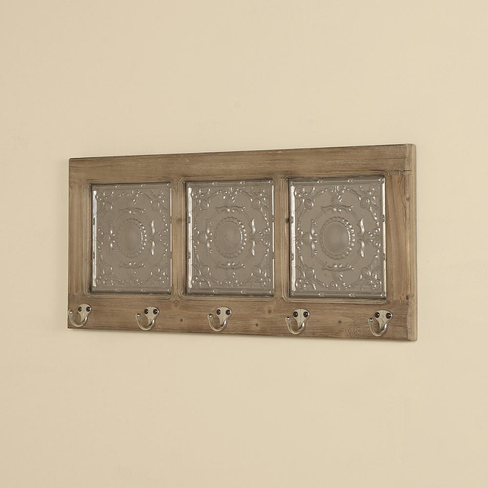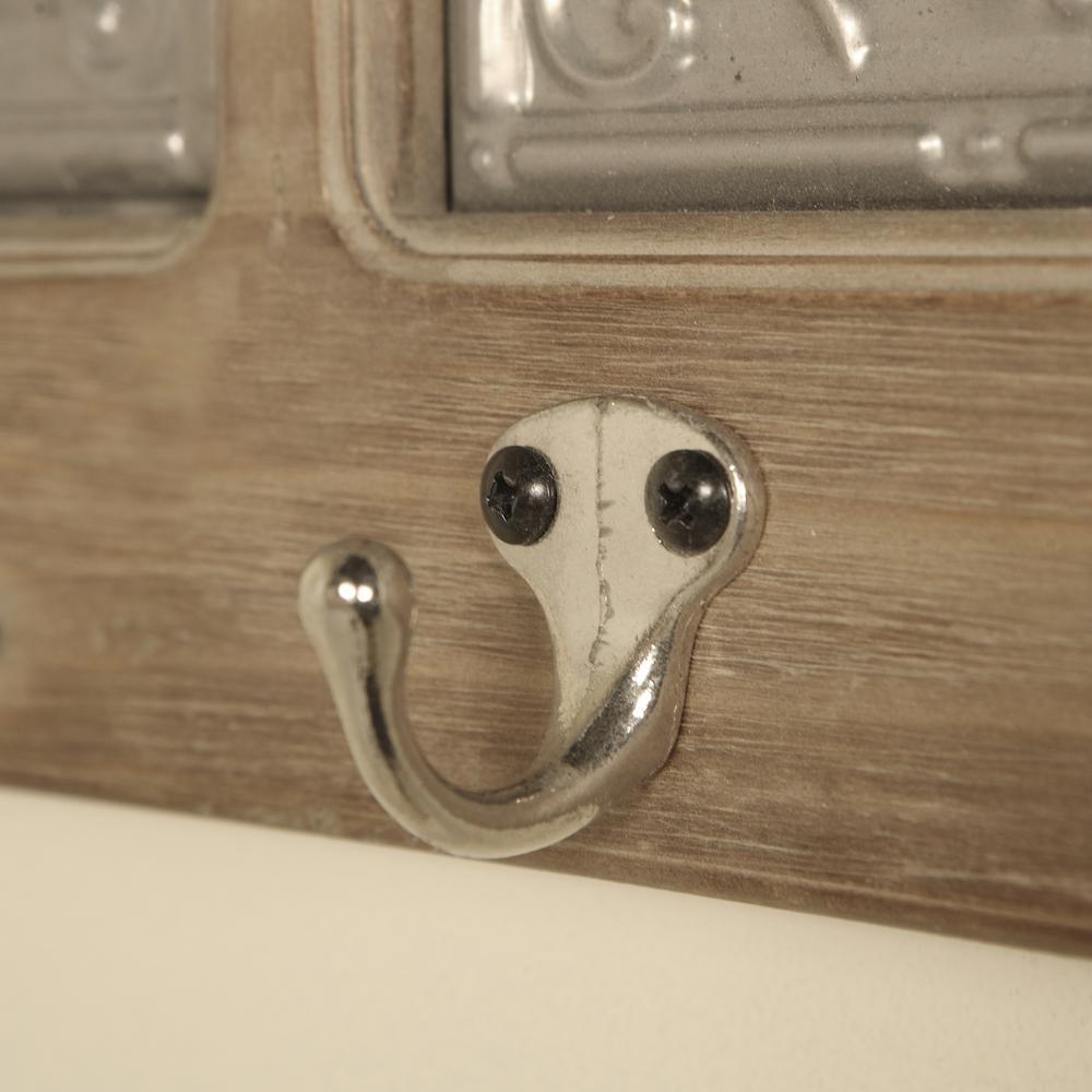 With its slightly rustic look and silver tin inserts, this wood and metal coat rack will accentuate your interiors with its rustic charm. There are 5-silver hooks on this plague that are perfect for hanging almost anything. Perfect for almost any room or decor.