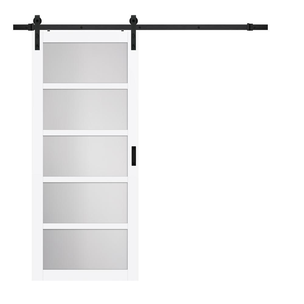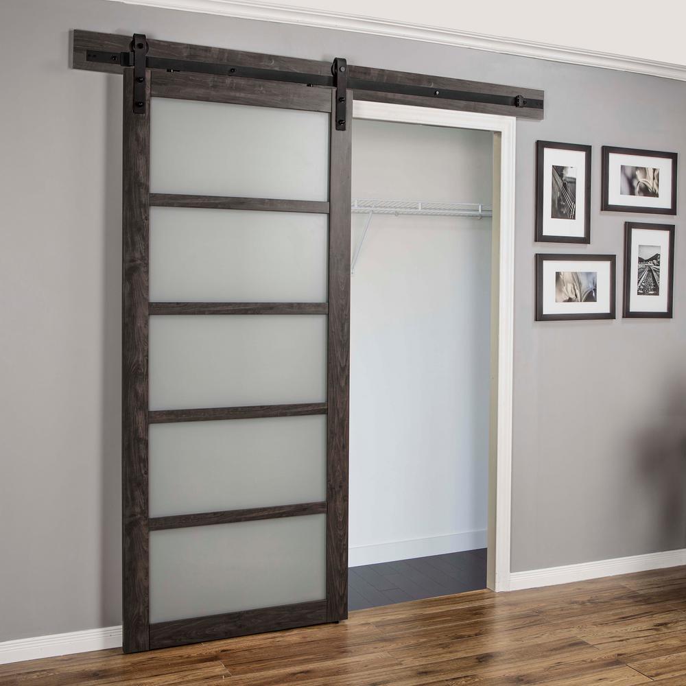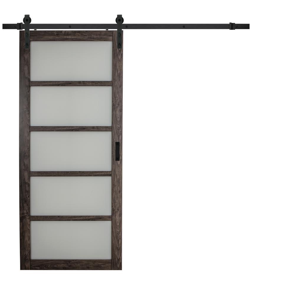 36 in. x 84 in. Iron Age Gray MDF Frosted Glass 5 Lite Design Sliding Barn Door with Rustic Hardware Kit