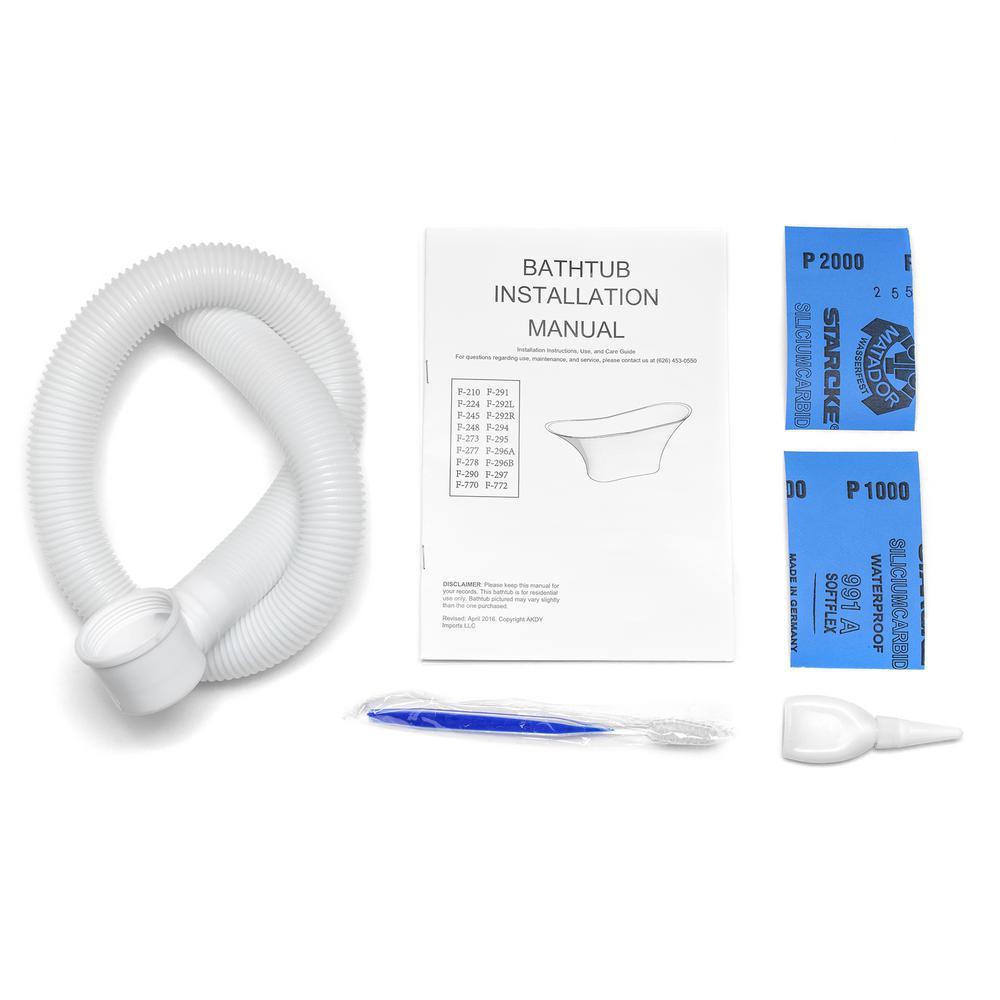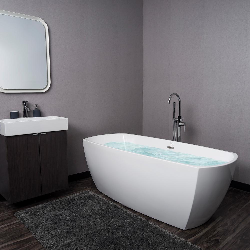 Indulge yourself in a relaxing bath experience with this AKDY 69 in. smooth freestanding acrylic bathtub. This freestanding bathtub brings tranquility and comfort with its curved side features. The tub can be filled up to 14 in water depth and has an overflow in case it goes a bit over. The drain is located on the center of the bathtub. Both the overflow and drain are outfitted in a beautiful chrome to perfectly match the sleek acrylic white finish. The sitting area measures at 46.5 in. L x 18.5 in. W. The installation is a breeze, and made easy, so that it can be used with your existing plumbing. A flexible tube drain is connected from your new bathtub to your existing plumbing with ease. All our bathtubs are covered by a 1-year parts warranty.