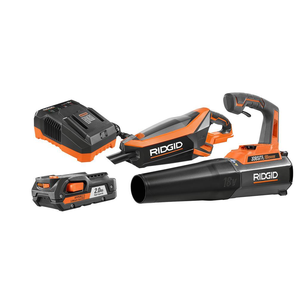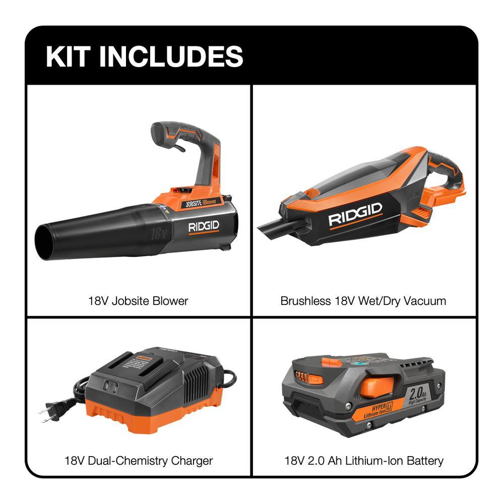 • Includes: (1) R8604301B 18-Volt Jobsite Handheld Blower, (1) R86090B Brushless Vacuum (Tool-Only) with Floor Nozzle, Crevice Nozzle and 2 ft. Extention Tube, (1) AC840086 2.0 Ah Battery, (1) R86092 18-Volt Charger, and operator's manuals