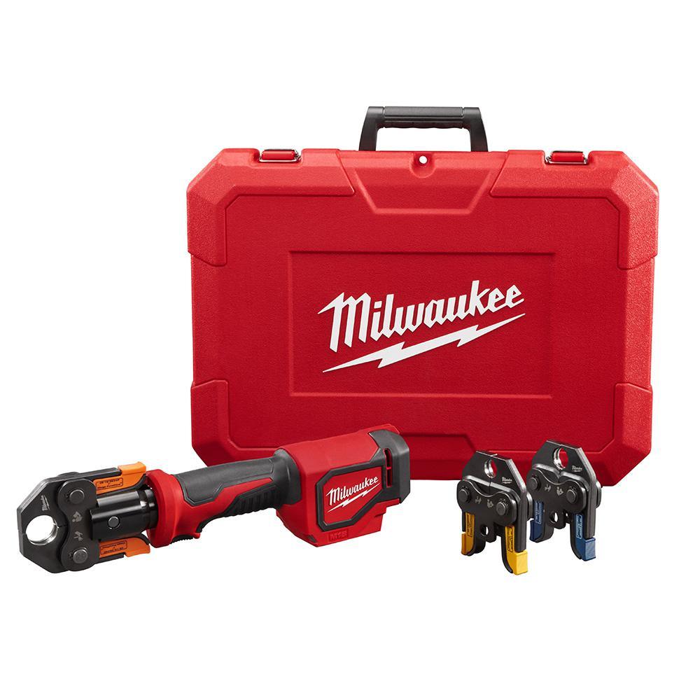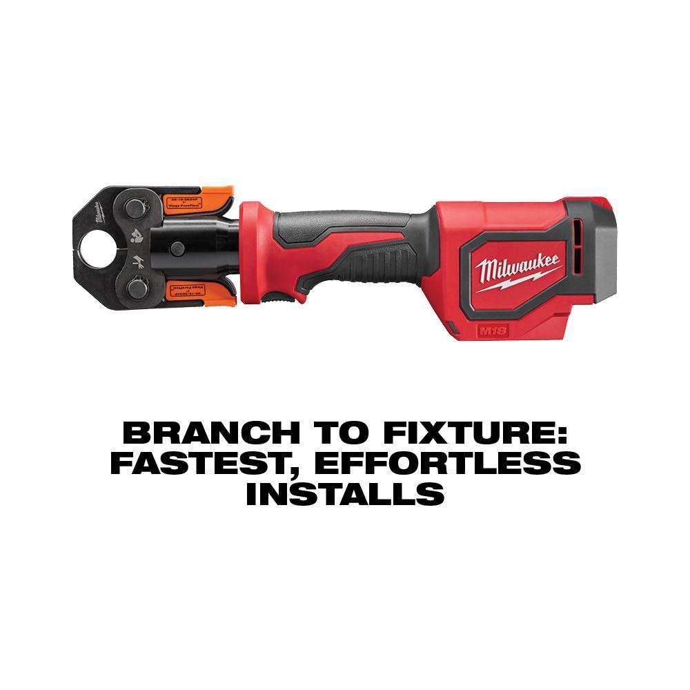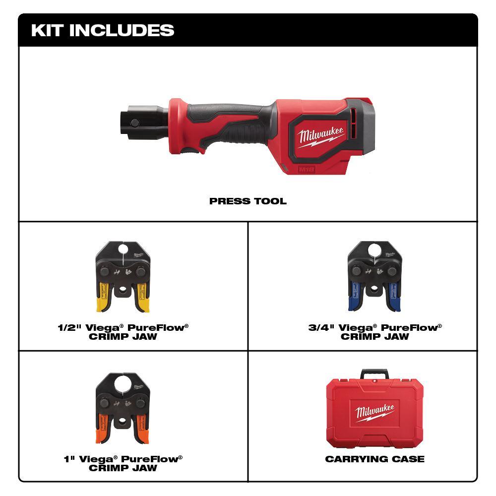 The MILWAUKEE M18 Short Throw Press Tool with Viega PureFlow Jaws is the fastest press tool on the market, pressing 40% faster than the competition providing users with the fastest, effortless installs from branch to fixture. The press tool is designed for one-handed use and is an easy-to-use solution compared to hand tools. Spring-loaded jaws grip the ring giving users precise alignment on the fitting, while Auto Cycle ensures a full press every time delivering the added assurance of quality connections. The plumbing press tool provides force optimized for residential installs and eliminates the downtime caused by calibration intervals, reducing user cost of ownership, and maximizing productivity for the residential installer. The cordless press tool is powered by Milwaukee's M18 REDLITHIUM battery, allowing users to Cut, Fasten, and Connect on One System. In addition to the tool, this kit includes 1/2 in., 3/4 in. and 1 in. PEX crimp jaws, and a carrying case.