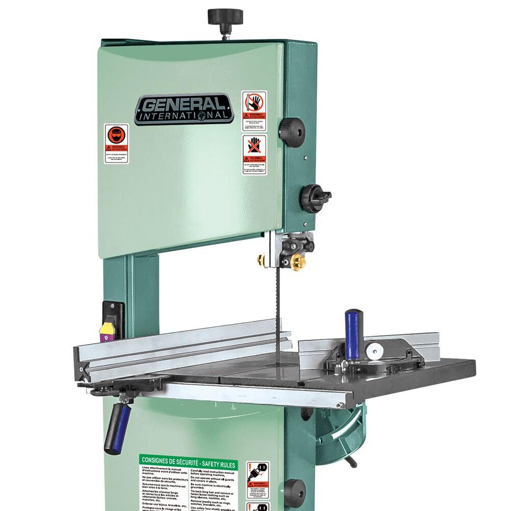 The General International 4 Amp 12 in. Woodcutting Band Saw features a steel frame and precision balanced internal working wheels with replaceable tires for maximum durability. Includes an easy-to-assemble, open-base sturdy steel stand. Includes precision easy-adjusting European style blade guide bearings. 2 cutting speeds makes for excellent results in either hard or soft woods. A Miter gauge with aluminum crosscut fence is included as a bonus. Hinged doors and easily accessible blade tension knob, for fast blade changes and adjustments. Extra-large designed 21-1/2 in. x 15-3/4 in. cast-iron table for stability and durability. The oversized paddle, safety lock-out on/off switch with removable key, prevents unauthorized use and easy to shut on and off. The bonus, multi-size dust port fits 4 in., 3 in. or 2 in. hose. Limited 2-year warranty.