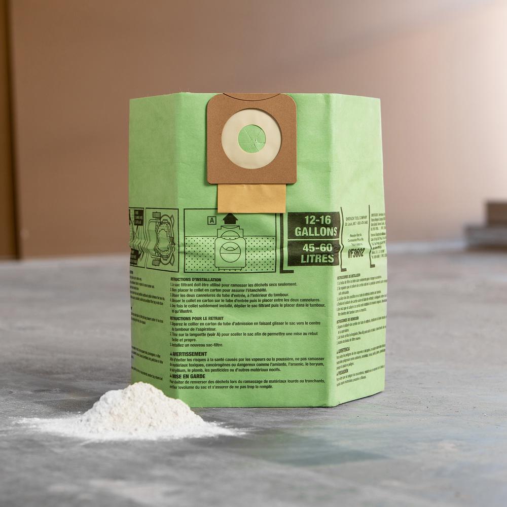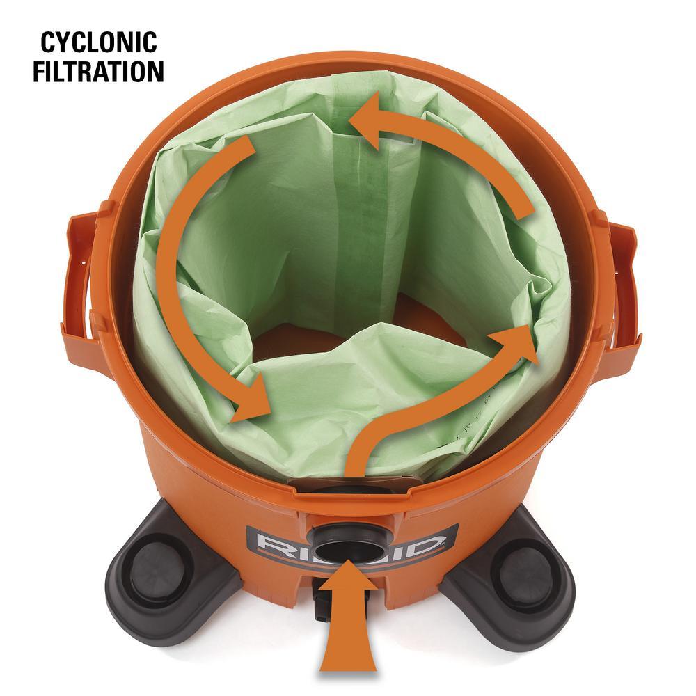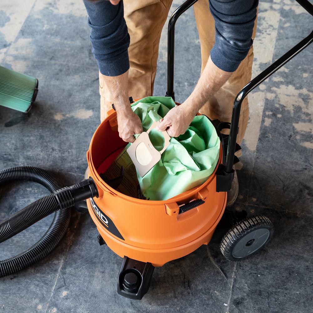 The RIDGID premium cyclonic dry pick-up dust bags achieve HEPA-level filtration up to 99.97% at 0.3 microns and larger in select RIDGID 12 Gal. to 16 Gal. wet dry vacs when installed with the RIDGID VF6000 filter. These dust bags help you capture and clean up fine particles such as concrete dust, drywall dust and fine powders while keeping the vacuum drum clean and the particles out of the air. Dust bags facilitate cyclonic airflow, resulting in pre-separation and more equal distribution of fine particles and debris throughout the bag. The sealing collar feature allows for clean and easy debris disposal. Simply remove the bag and use the collar to seal the debris inside the bag. Includes 2 premium cyclonic dust bags that fit select 12 Gal. to 16 Gal. RIDGID wet dry vacs. See list of select vacs listed below.