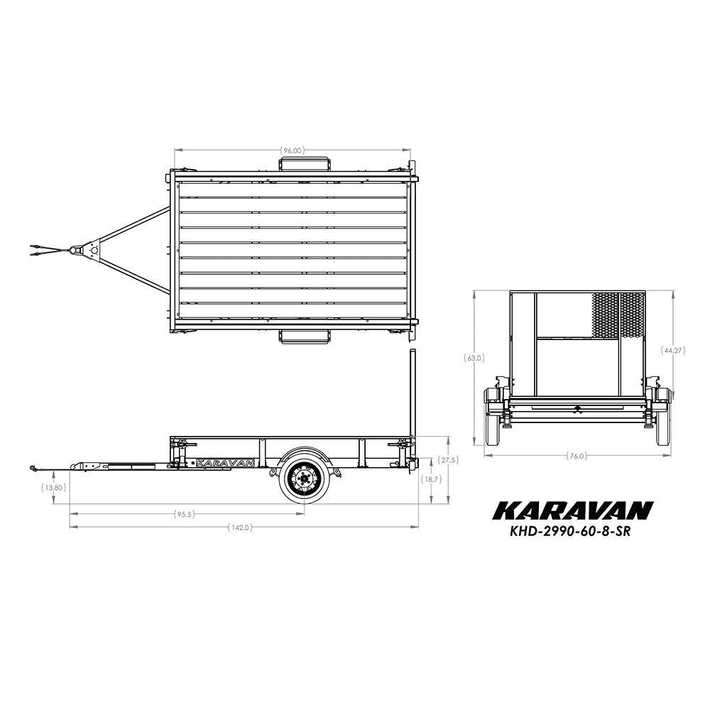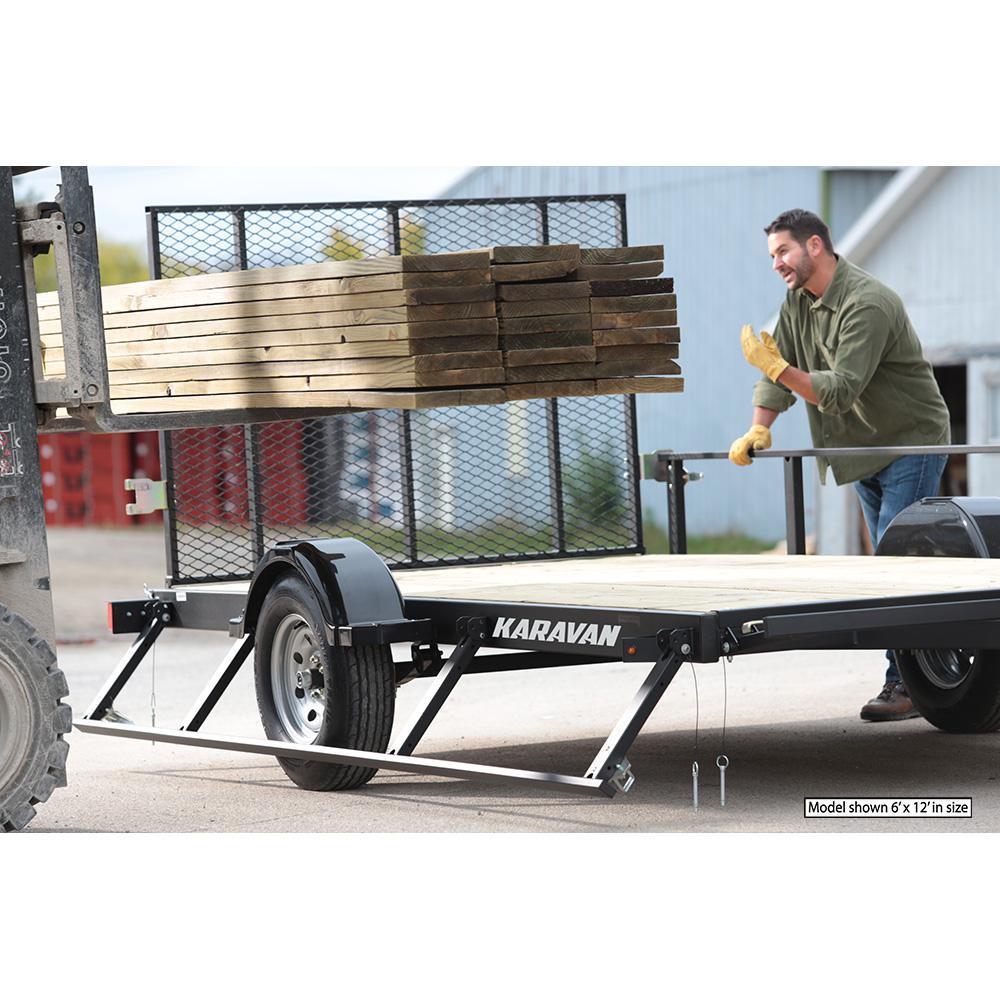 This uniquely designed 5 ft. x 8 ft. Karavan Trailer incorporates a pivoting front and side rail system with lockable latches. Pallet loads can easily be loaded from either side of the trailer by simply lowering the side rails. The system also allows for longer and wider loads.