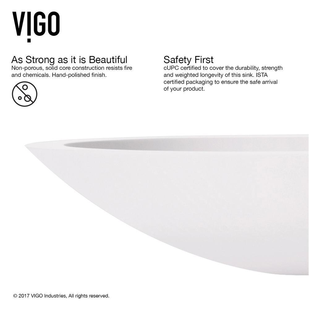 The VIGO Wisteria Matte Stone Vessel Sink with the Linus Vessel Faucet is a timeless way to update any modern bathroom. The sink's oval shape is distinct to this model, making it as visually pleasing as it is functional. Its Matte Stone composition features non-porous composite, which is scratch, fade and impact resistant. To balance this sink is the 7-layer coated finish Linus vessel faucet. Constructed of solid brass, this faucet is protected against rust, tarnish and corrosion. A matching pop-up drain completes this bathroom sink set.