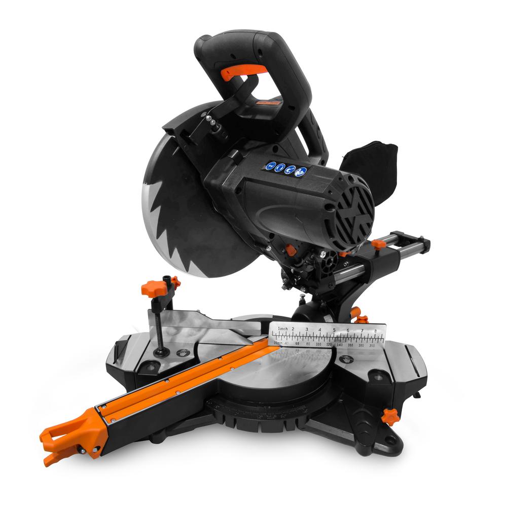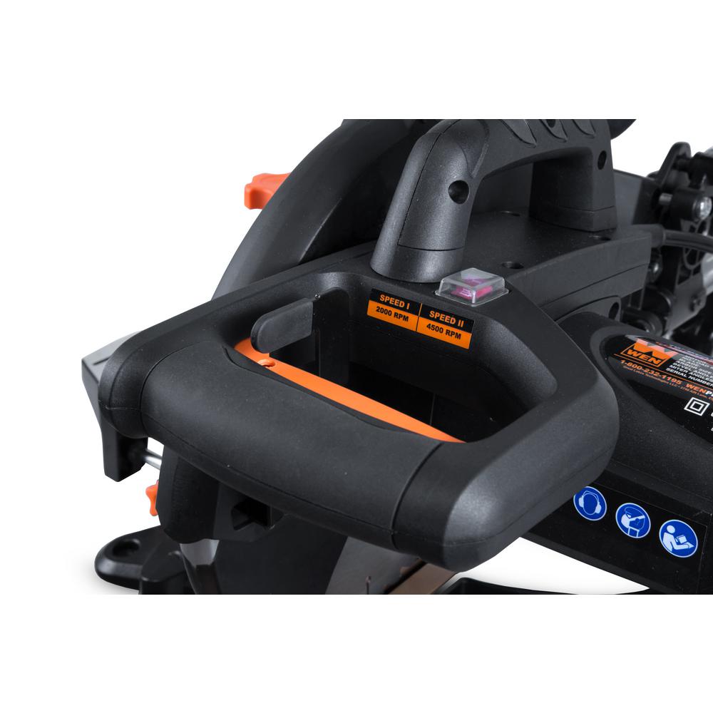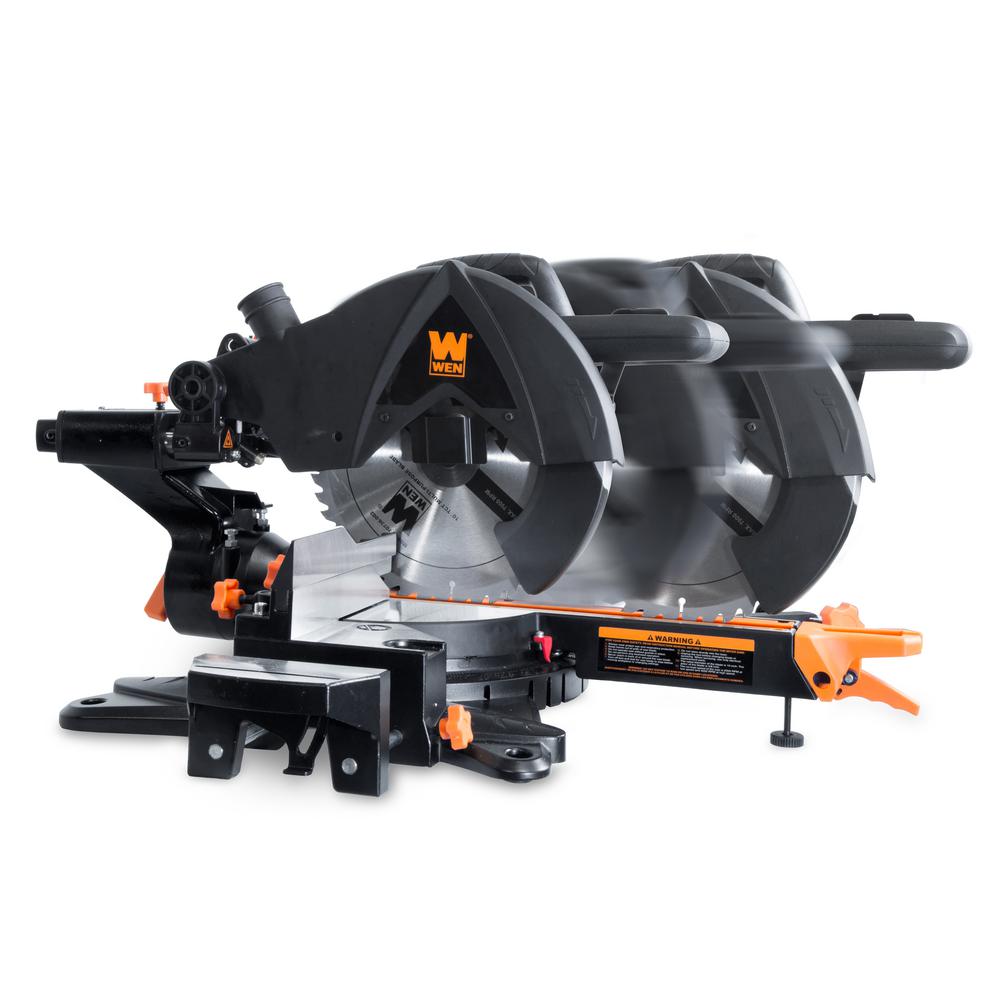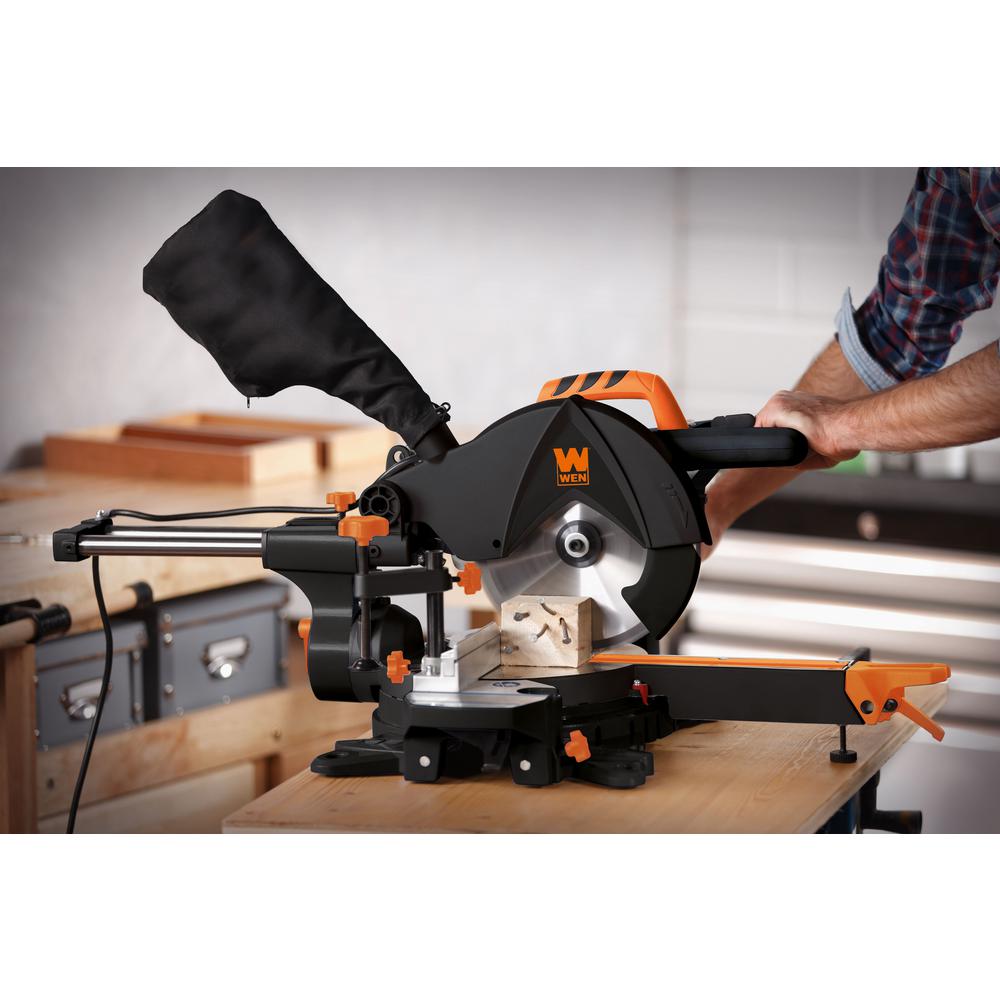 Remember when you could cut through a board full of nails. We aren’t kidding. You can literally slice through a wooden board full of metal nails with the WEN 2-Speed Single Bevel Sliding Compound Miter Saw. This saw’s smart power technology implements an internal speed detection system to maintain consistent RPMs through materials of varying hardness. That means the saw’s torque automatically adjusts, increasing when sawing through knots and nails and decreasing for softer portions of the work piece. Combine that with our 15-Amp motor for a versatile tool that can handle even the toughest of projects. With the WEN 2-Speed Miter Saw, you can select your preferred speed with the simple flick of a switch for operation at either 2000 or 4500 rotations per minute. Switch on a metal-cutting blade to take on aluminum, steel and more. Bevel the head of the saw up to 45° to the left and miter up to 45° in either direction. Cut boards up to 12 in. wide and 3-1/2 in. thick or make compound cuts (45° bevel and 45° miter) 8-1/2 in. wide and 1-7/8 in. thick. This package also includes a 10 in. 48-tooth carbide-tipped blade for woodworking, 2 retractable work stops, 8 positive miter stops, one clamp assembly, 2 removable table extensions, a laser and a dust bag.