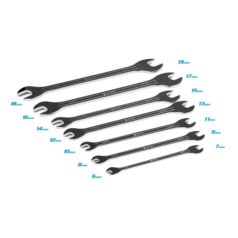 Set of 7 open end wrenches with 14 metric sizes: 6, 7, 8, 9, 10, 11, 12, 13, 14, 15, 16, 17, 18, and 19 mm