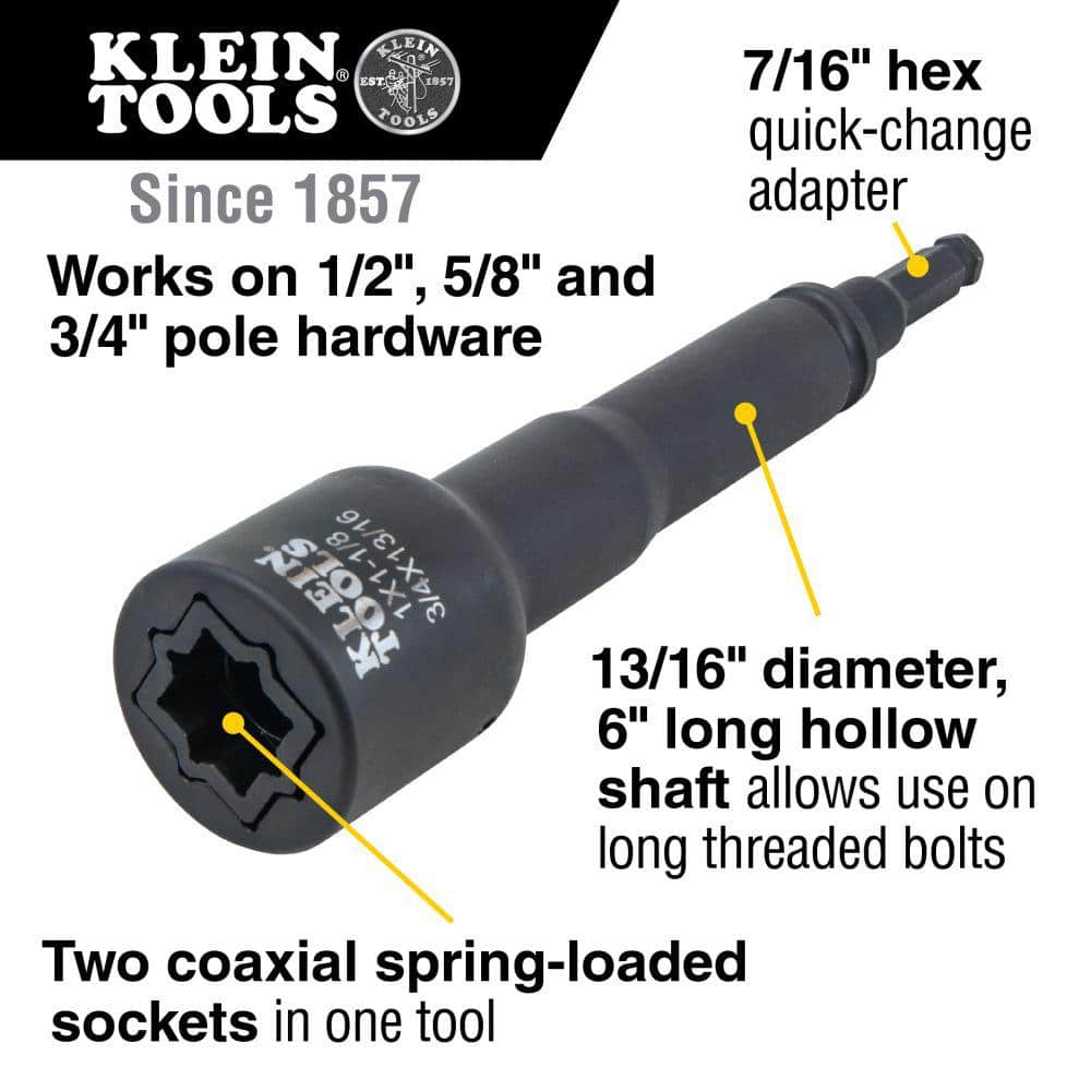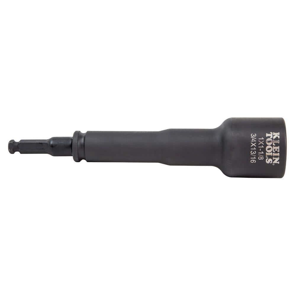 Featuring 2 spring-loaded sockets in 1 tool, the 4-in-1 Impact Socket Wrench allows for hands-free installation and removal of pole hardware. With sizes ranging from 3/4 in. to 1-1/8 in. in square sockets and a 7/16 in. hex quick-change adapter, this tool is designed for use with impact drivers, making the job quicker and easier. The single-ended impact socket also includes a 6 in. hollow shaft for use on long threaded bolts and a cross hole design to prevent separation of the adapter and socket. A replacement adapter (NRHDA4) is also available for use.