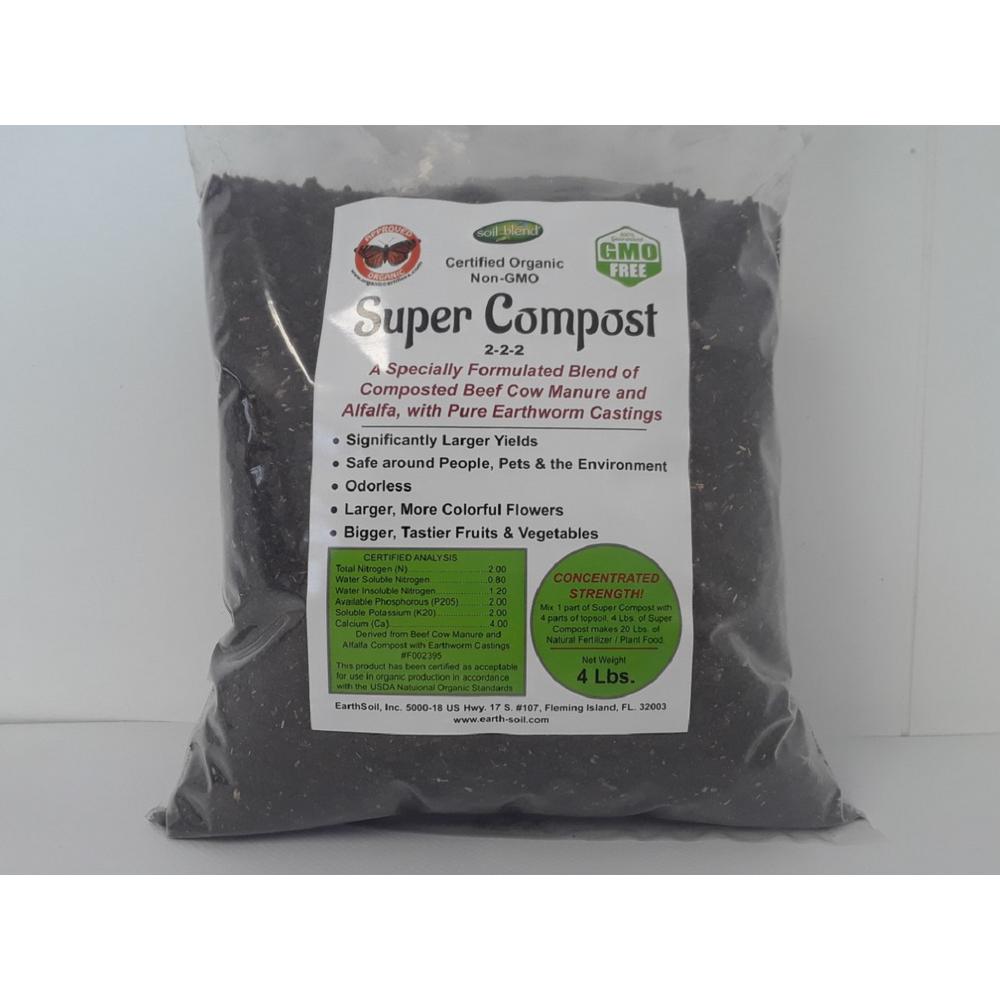 Soil Blend Super Compost 2-2-2 is a Specially Formulated blend of Composted Beef Cow Manure and Alfalfa blended with Pure Earthworm Castings. NPK of 2-2-2 and is high in Calcium, Iron, Magnesium and Sulfur. One 4 lbs. bag makes 20 lbs. of Natural, Organic potting mix, seed starter, plant food and soil amendment all in 1. Certified Organic/Non-GMO/American Vegetarian Association Approved and Recommended/Sustainable. You can expect Larger Flowers with More Colorful Blooms as well as Significantly Higher Yields and Larger, Tastier vegetables. High Microbial Activity.