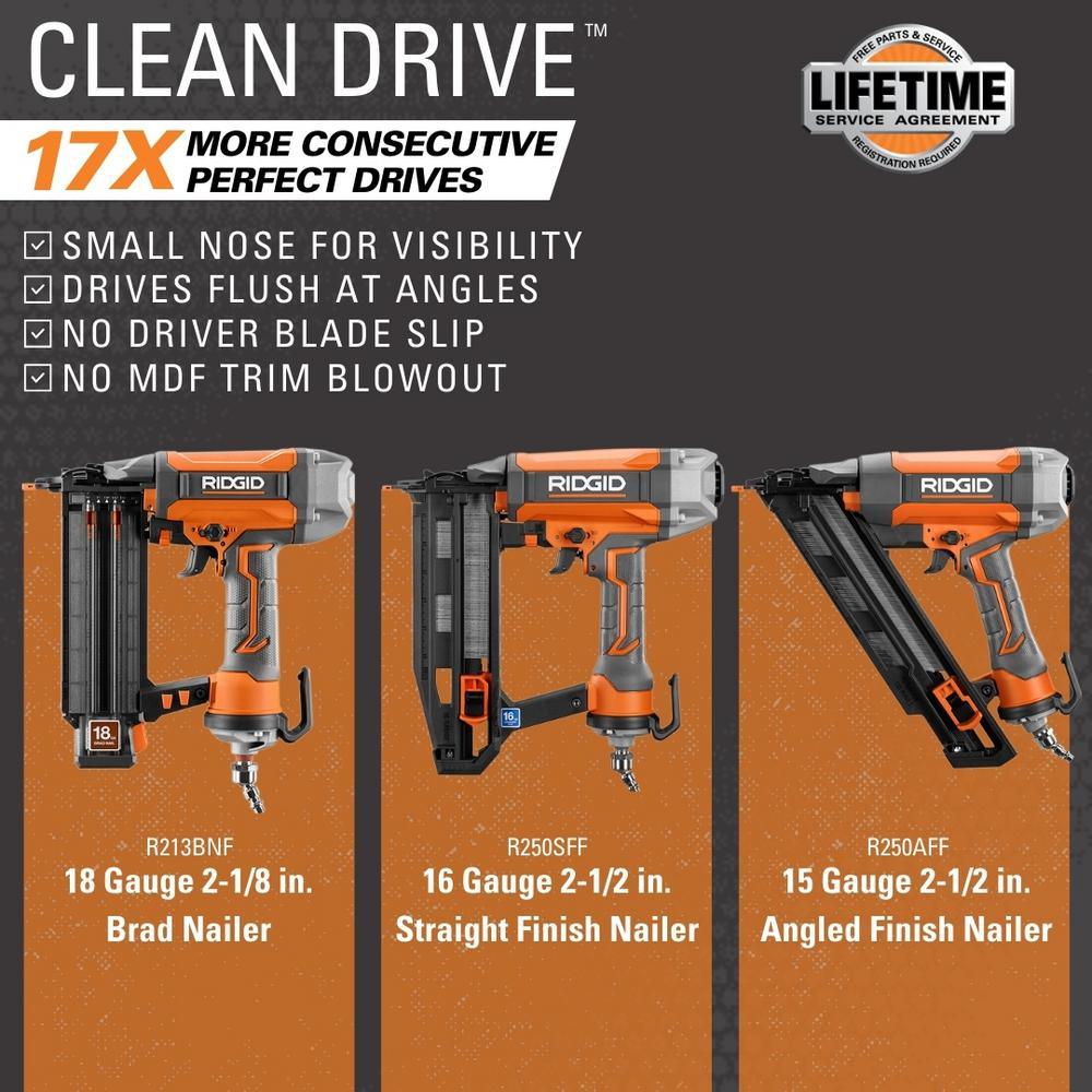 RIDGID introduces the 18-Gauge 2-1/8 in. Brad Nailer with CLEAN DRIVE Technology, Tool Bag, and Sample Nails. This 18-gauge brad nailer features CLEAN DRIVE Technology, which boasts 17X more consecutive perfect drives than the competition. CLEAN DRIVE Technology means you can spend less time fixing and more time working. With registration, this nailer is backed by the Industry's Only Lifetime Service Agreement. Included with the 18-Gauge 2-1/8 in. Brad Nailer are a tool bag, sample nails, and an operator operator's manual.