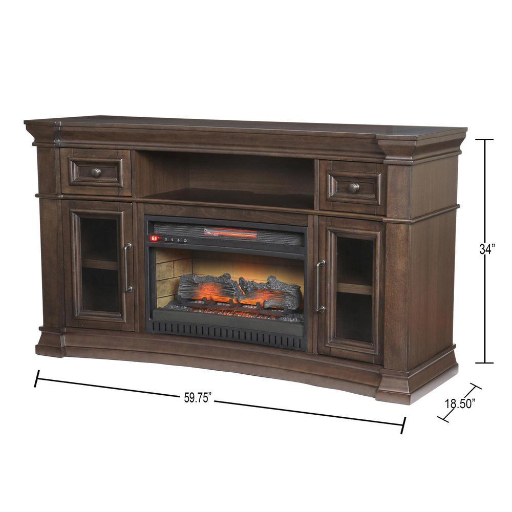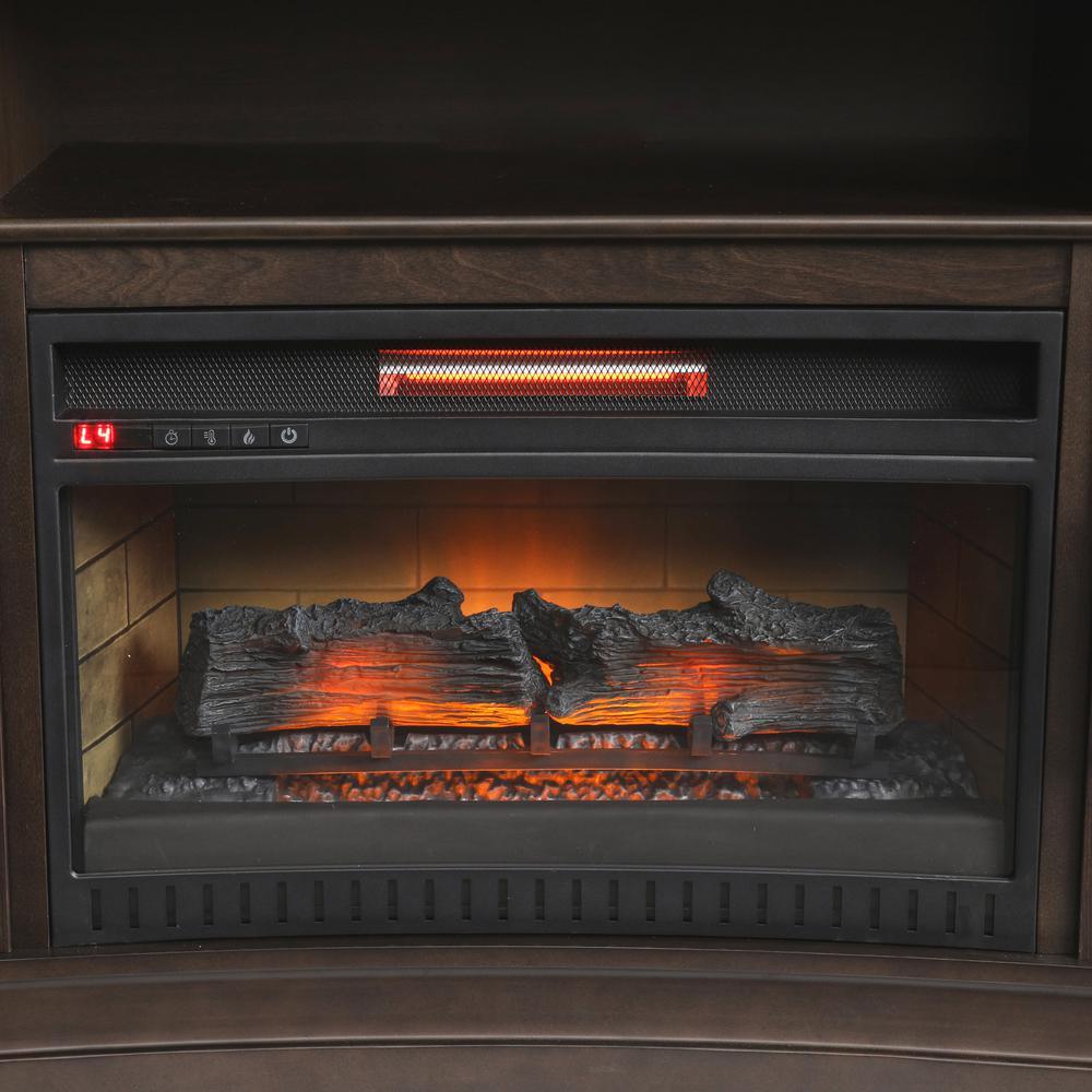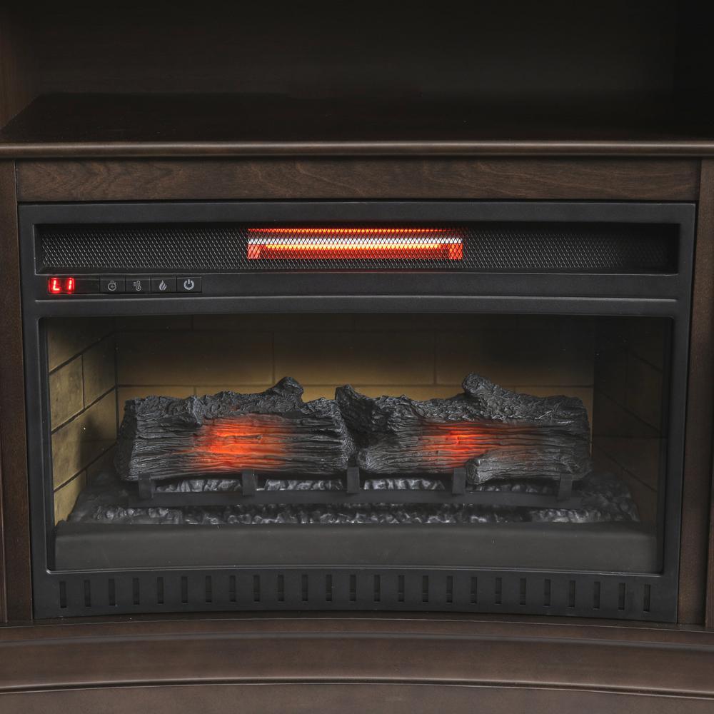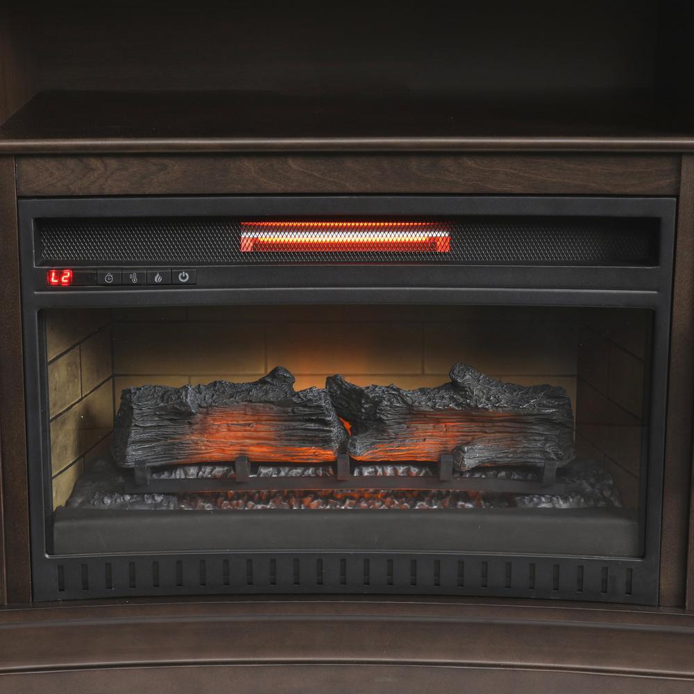 Celebrate the rich comfort and warmth of a fireplace hearth in any room of your home. The 60 in. special concave Electric Fireplace offers a fresh and stylish design. The realistic log and flames are powered by energy-efficient LED technology and offer four flame heights. Enjoy cozy fires year round with or without heat, all controlled by the provided remote control. This fireplace console is constructed of hardwoods and laminates with a stunning coffee finish. It can accommodate flat screen televisions and includes front and side panels for storing media and gaming accessories. With its 5,200 BTU infrared quartz heater and temperatures ranging 62 and 82 degrees F, this fireplace heater can evenly warm rooms up to 1,000 sq. ft. It features a flip-up barrister door-front for using and storing components. The console requires assembly.