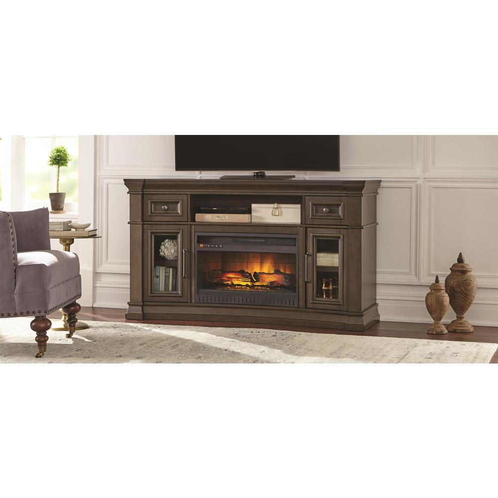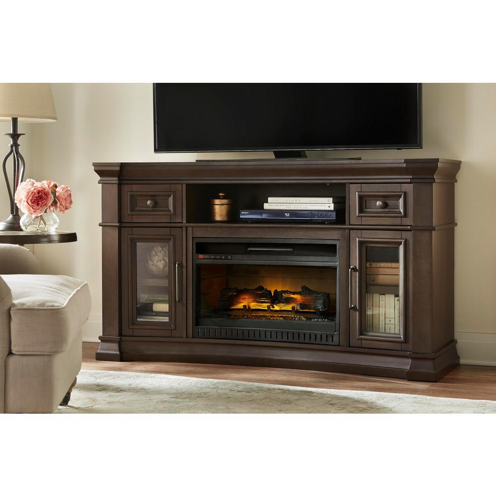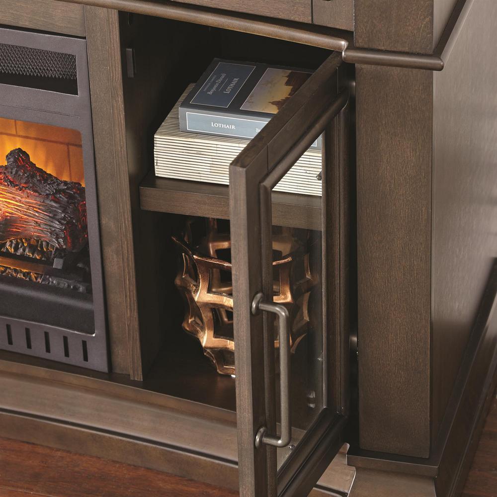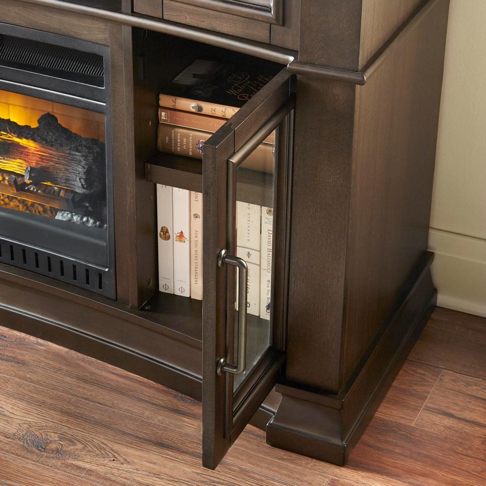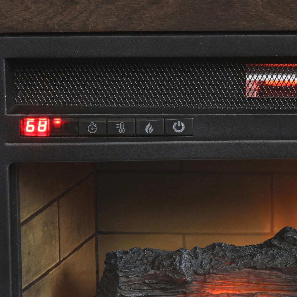 Celebrate the rich comfort and warmth of a fireplace hearth in any room of your home. The 60 in. special concave Electric Fireplace offers a fresh and stylish design. The realistic log and flames are powered by energy-efficient LED technology and offer four flame heights. Enjoy cozy fires year round with or without heat, all controlled by the provided remote control. This fireplace console is constructed of hardwoods and laminates with a stunning coffee finish. It can accommodate flat screen televisions and includes front and side panels for storing media and gaming accessories. With its 5,200 BTU infrared quartz heater and temperatures ranging 62 and 82 degrees F, this fireplace heater can evenly warm rooms up to 1,000 sq. ft. It features a flip-up barrister door-front for using and storing components. The console requires assembly.