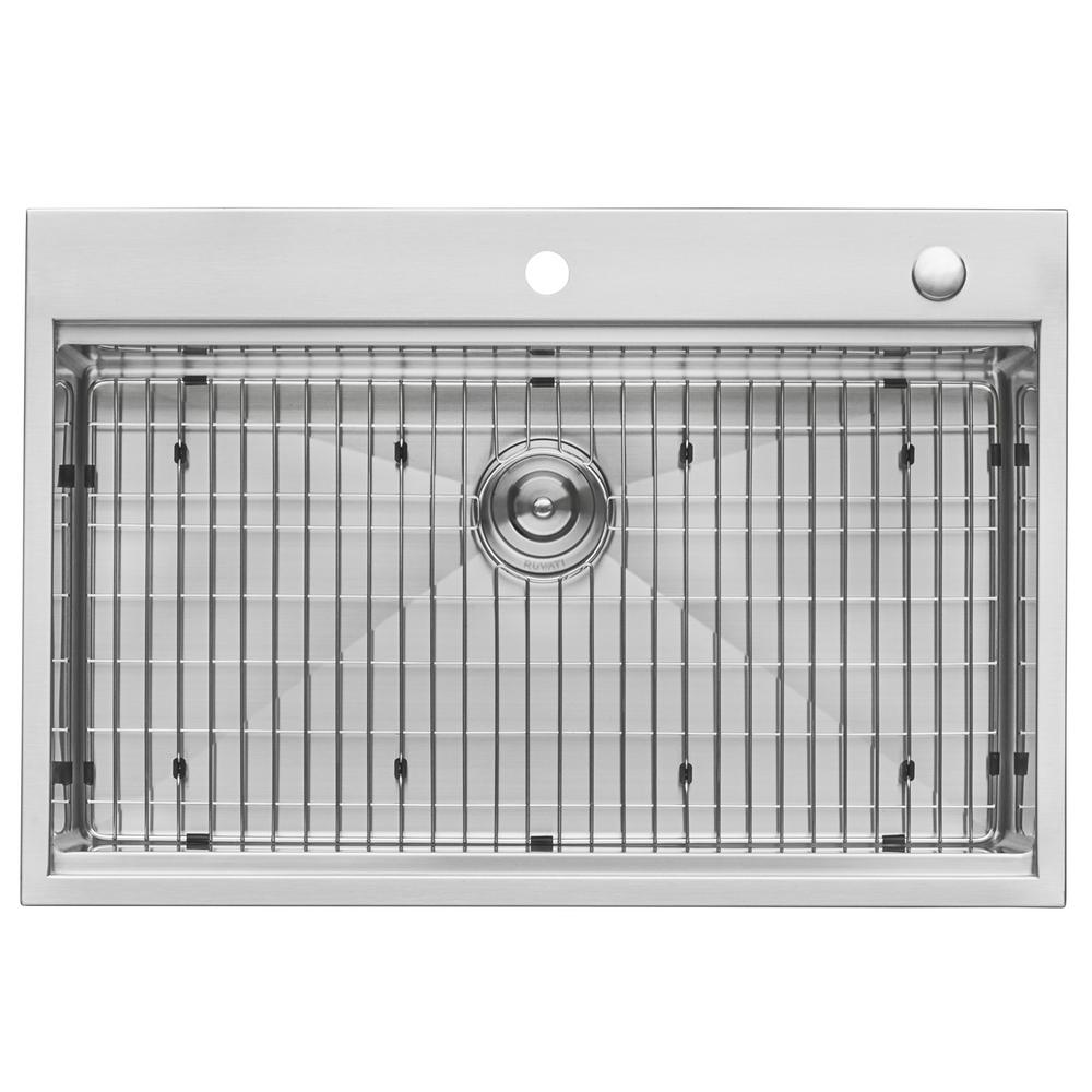 This Workstation sink from Ruvati's Tirana series combines a solid top-mount rim with a functional workstation: built-in accessories (colander, cutting board and foldable dish drying rack) that slide on the integrated tracks in the sink. Includes a deep stainless steel colander that you can use as strainer. The solid hardwood cutting board is constructed of Sapele wood - a luxurious wood that has a beautiful finish and handles water well. The foldable dish drying rack, made of stainless bars held together with flexible silicone, folds out on the track and is ideal as a dish drying rack. The sink features a 1 in. wide and 1/4 in. high rim all around that sits topmount on your countertop. The sink comes in a standard 33 in. by 22 in. dimension, so it will fit in most existing cutouts from your old overmount sink. Ruvati's Tirana workstation turns your sink into a complete work space - you can do all your prep work right on top of your sink, and keep your countertops clean and free of mess.