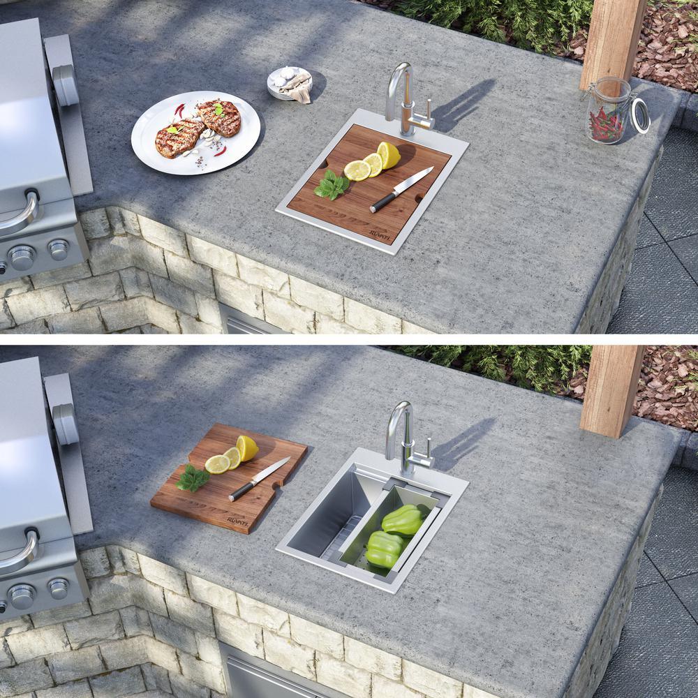 This Workstation sink from Ruvati's Roma series was designed with RV and Tiny Home customers in mind, but can be a perfect fit for any kitchen where you want to maximize utility within a small space. The sink comes with built-in accessories (colander and cutting board) that fit nicely on top of the sink, so you can do your prep work right on top of the sink. The solid cutting board is constructed of sapele wood - a luxurious hardwood that has a beautiful finish and handles water well. It covers the entire sink bowl, thus converting your sink into a countertop when you need. Also included is a 5 in. D stainless steel colander that you can use as a strainer or a drying caddy. The sink features a thick solid 8-Gauge (5 mm T) rim all around that sits top mount on your countertop. The rest of the sink is constructed of 16-Gauge stainless steel, 1 of the thickest steel available for residential kitchens. Whether in an RV or a bar prep area of your home, this workstation sink from Ruvati is the perfect combination of beauty and functionality.