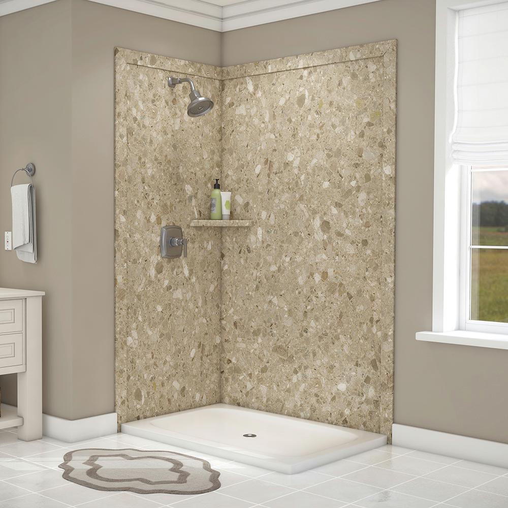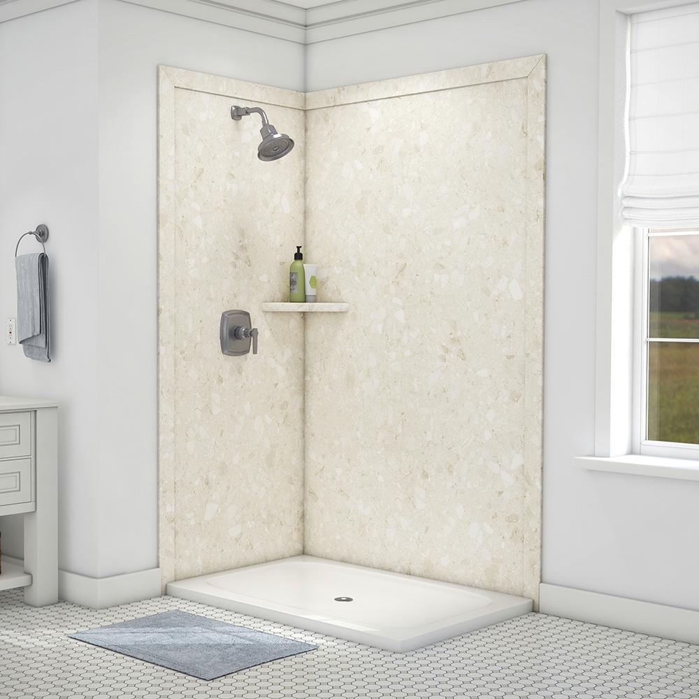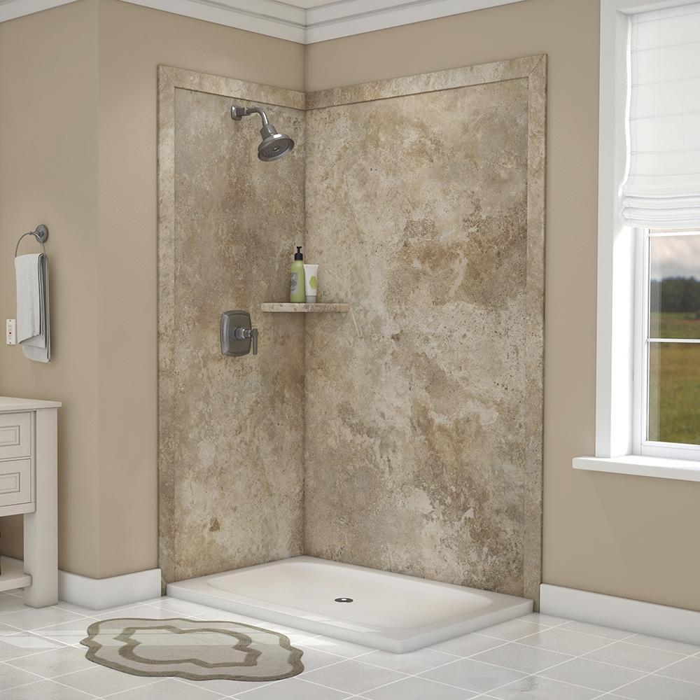 Surround yourself with the luxurious look of natural stone with FlexStone, the revolutionary tub and shower wall material that is easy to cut and install and easier still to clean and enjoy. The Elegance 2-panel Shower Surround Kit will fit openings up to 48 in. W x 36 in. D x 80 in. H and includes one 48 in. x 80 in. back wall panel, one 36 in. x 80 in. side panel, two 3 in. x 88 in. mitered side trim, two 3 in. x 50 in. mitered top trim, one corner shelf and inside corner reinforcements. The kit also includes specially-formulated adhesive to adhere FlexStone panels directly to sheetrock, cement board or other backer board material and color-matched silicone to finish all joints in the final step of installation.