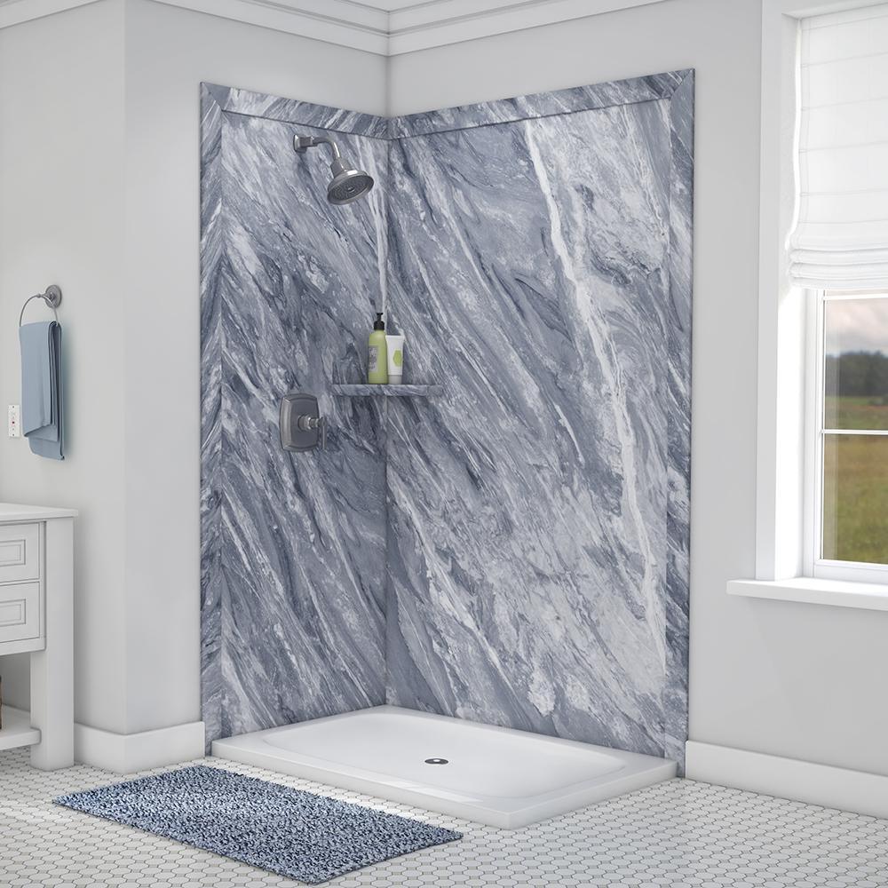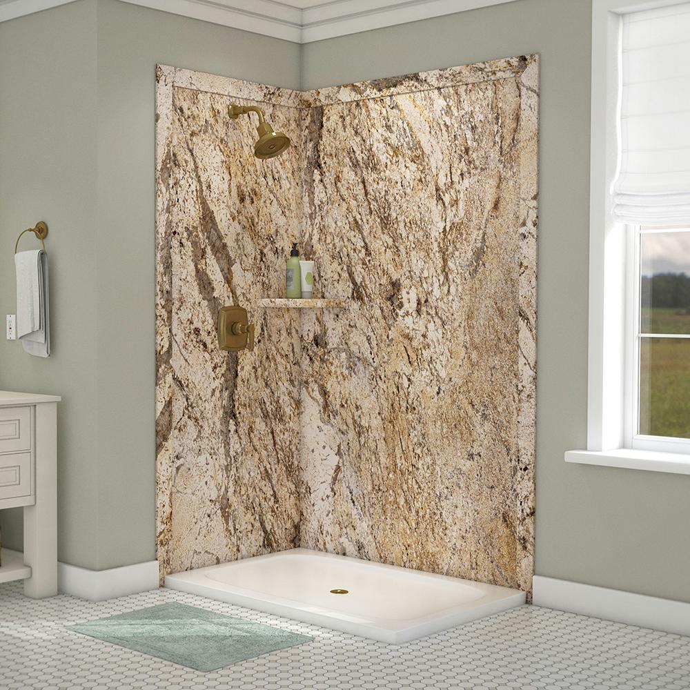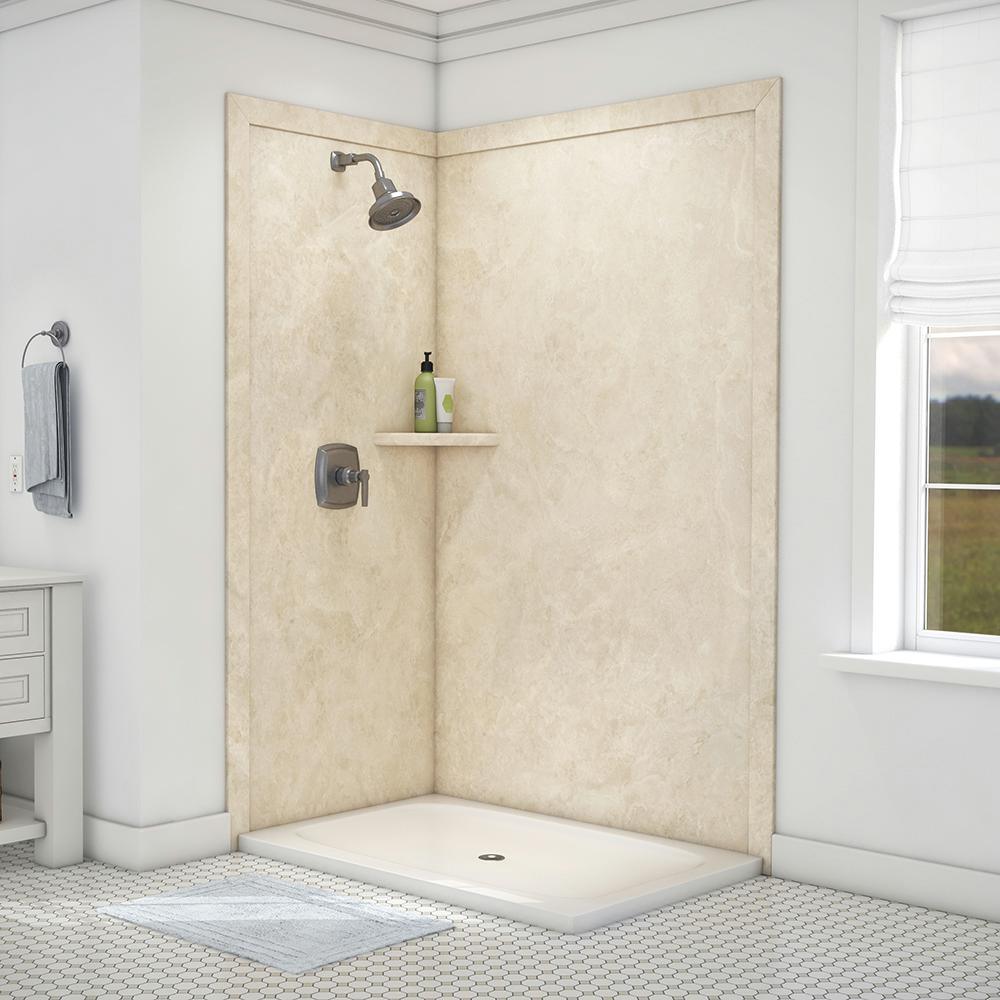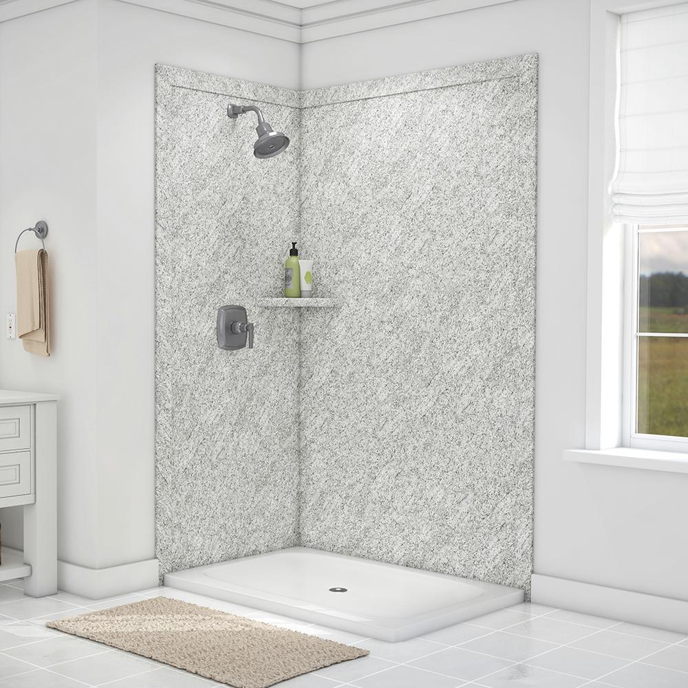 Surround yourself with the luxurious look of natural stone with FlexStone, the revolutionary tub and shower wall material that is easy to cut and install and easier still to clean and enjoy. The Elegance 2-panel Shower Surround Kit will fit openings up to 48 in. W x 36 in. D x 80 in. H and includes one 48 in. x 80 in. back wall panel, one 36 in. x 80 in. side panel, two 3 in. x 88 in. mitered side trim, two 3 in. x 50 in. mitered top trim, one corner shelf and inside corner reinforcements. The kit also includes specially-formulated adhesive to adhere FlexStone panels directly to sheetrock, cement board or other backer board material and color-matched silicone to finish all joints in the final step of installation.