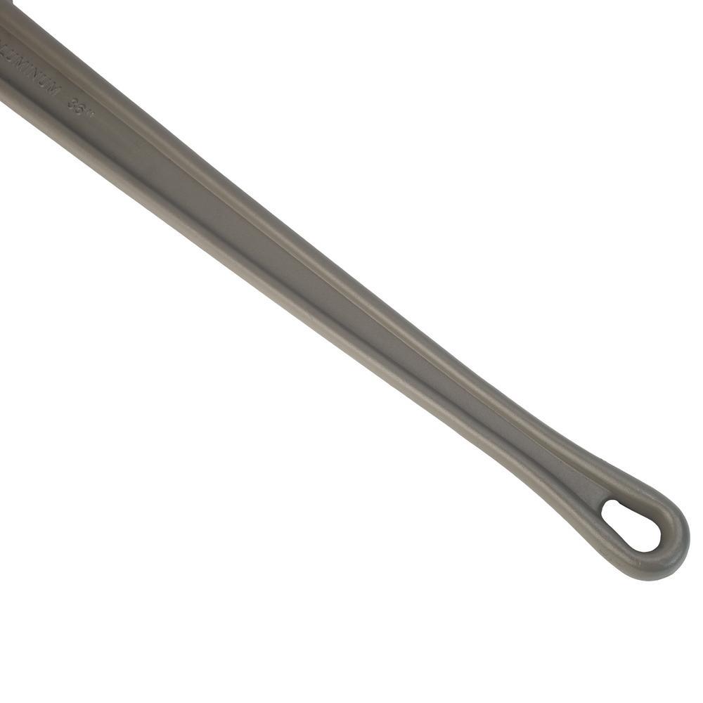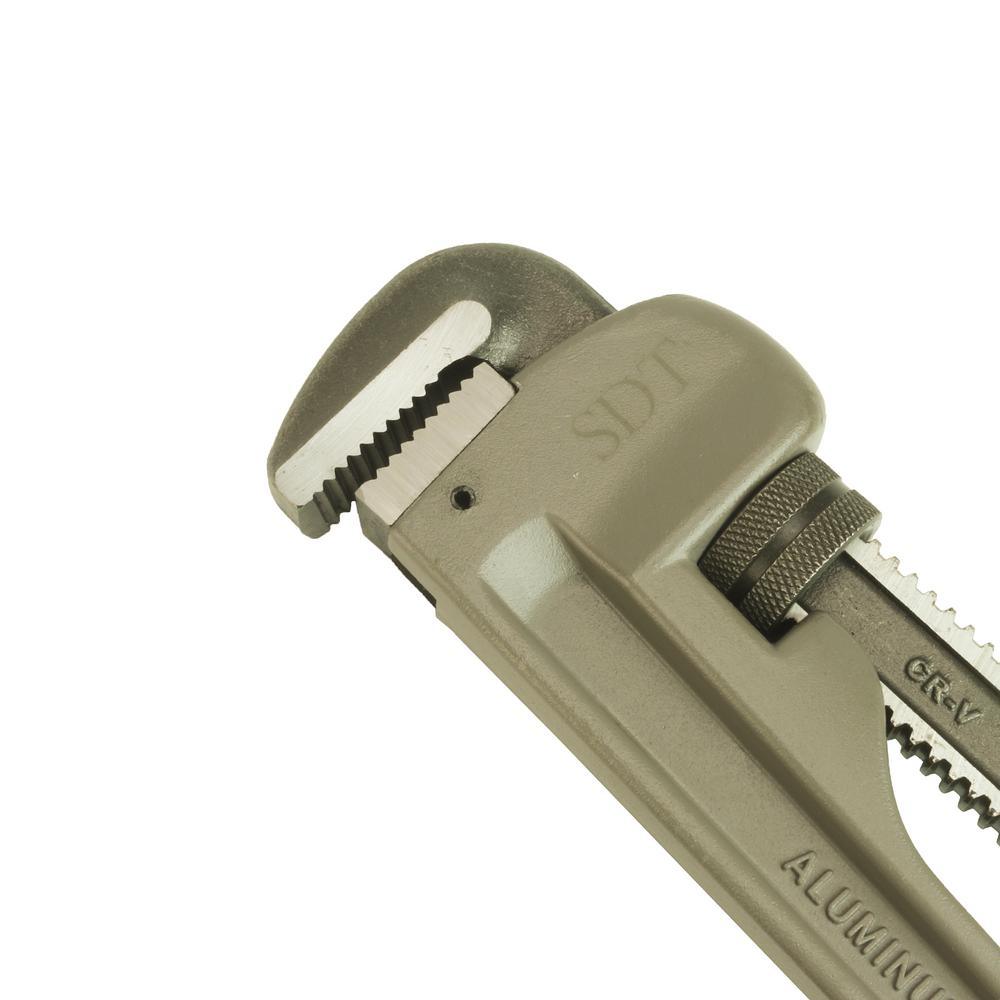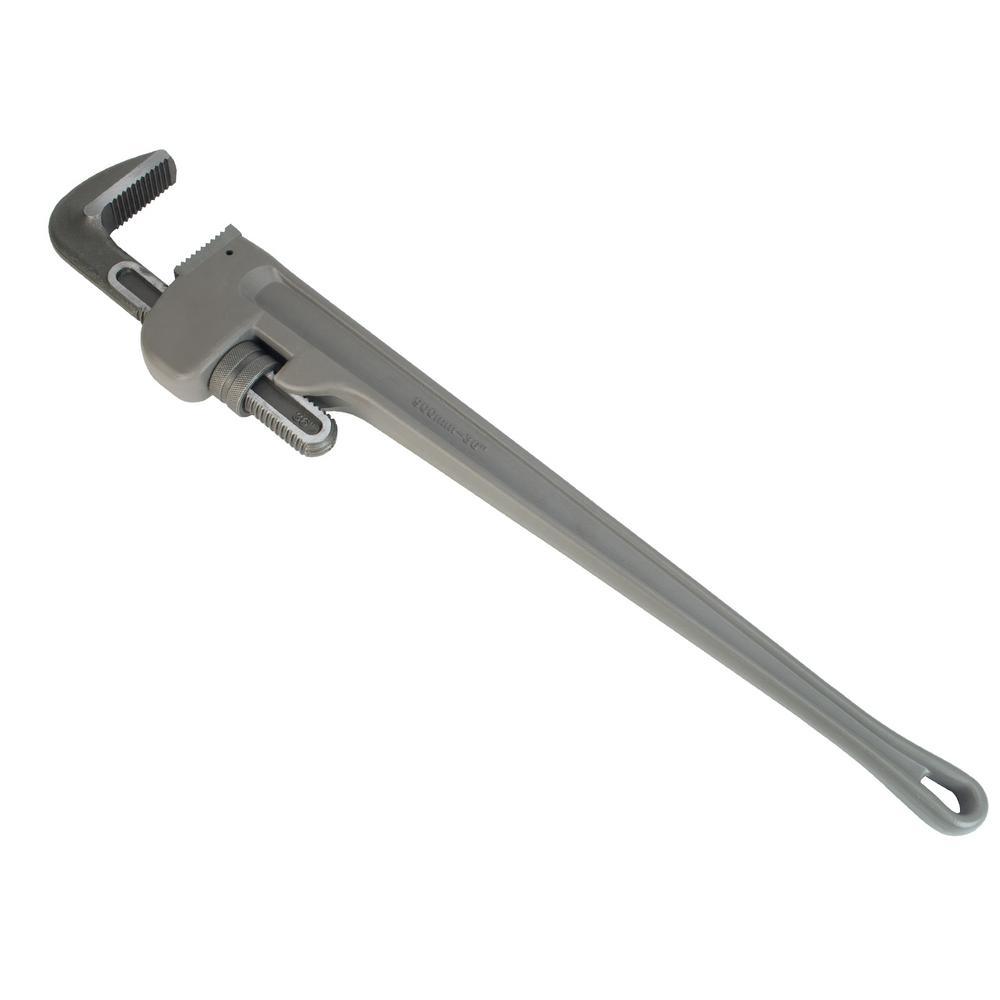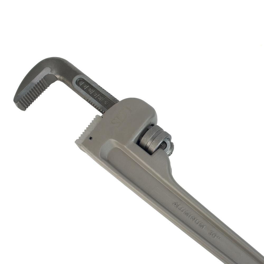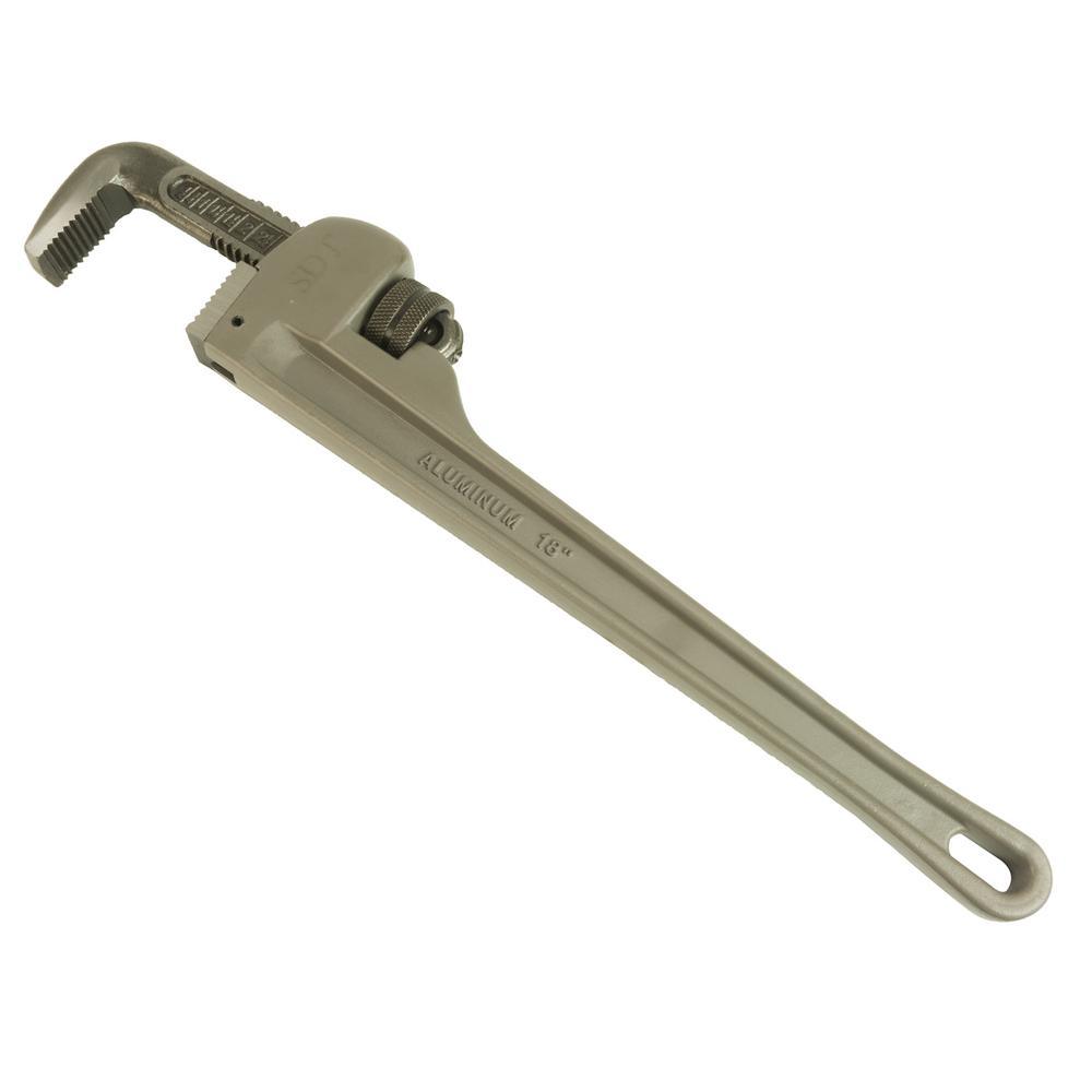 Steel Dragon Tools 18 in. Aluminum Straight Pipe Wrench 31100 features heavy-duty construction and a sturdy, aluminum I-beam frame. The I-beam frame helps keep the tool from weighing down the operators hand without sacrificing overall durability. Aluminum construction is nearly 40% lighter than comparable cast-iron wrenches. Self-cleaning threads with replaceable heel jaw will help the wrench operating for years to come. This wrench is ideal for use on 1/2 in. to 2 in. pipe with a maximum 2-1/2 in. pipe capacity. Wrench features replaceable hook and heel alloy steel jaws.