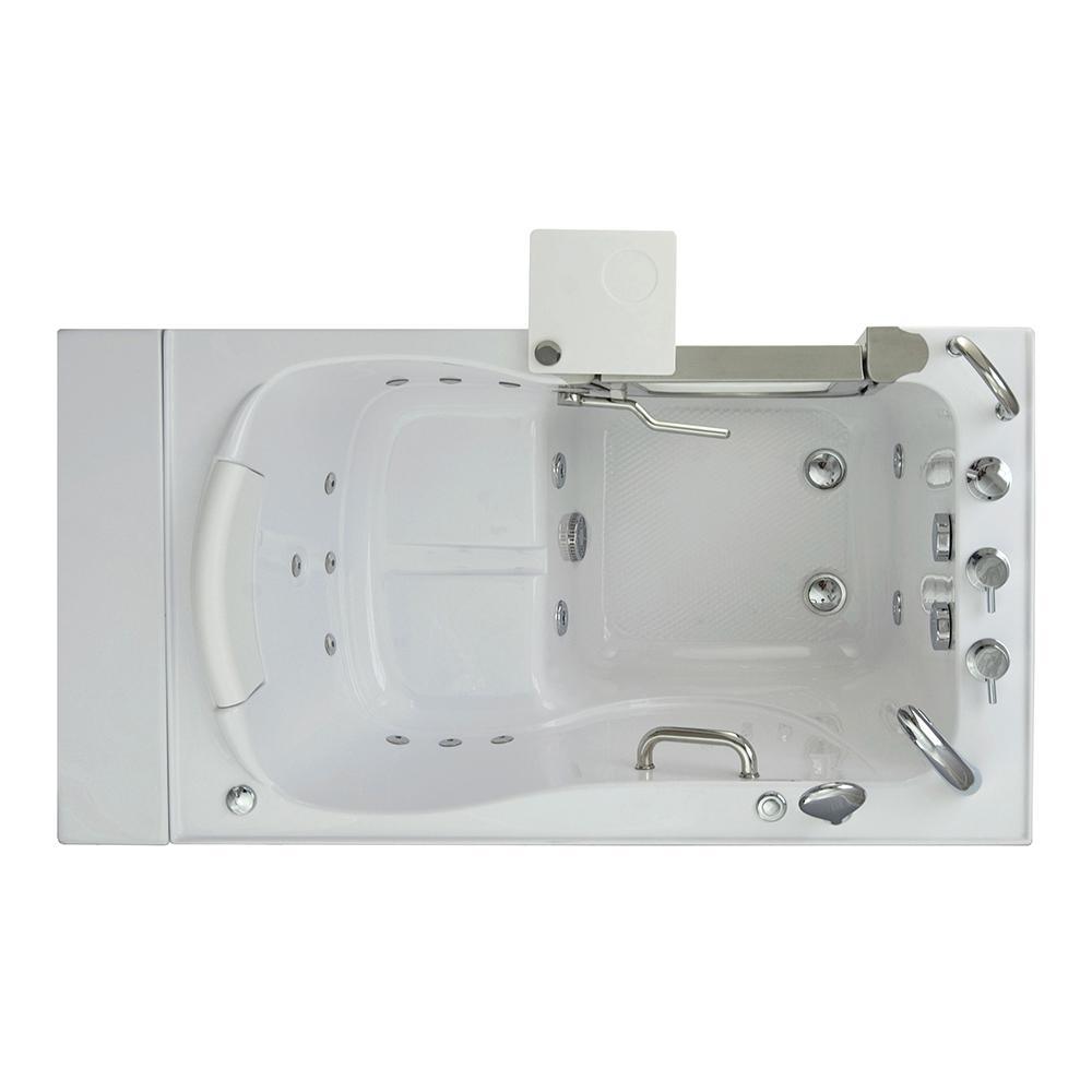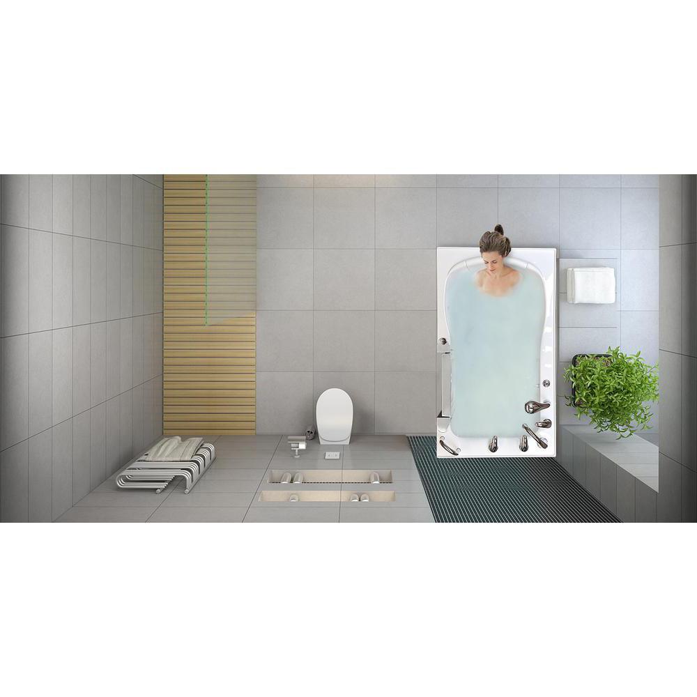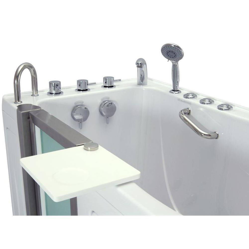 Ella's Bubbles delivers quality engineering in style with the Inward Swing Walk-In Bathtubs. Each Ella walk-in bathtub is made with a high-quality gloss finish acrylic shell along with a custom-made brushed stainless steel and tempered glass door to complement any home. Our tubs are equipped with gravity-driven Dual Drain Technology, providing efficient, fast and reliable drainage while exceeding the single 1.5 industry standard walk-in bath drains offered by competitors The Ella Royal Walk in Bathtub is our king-sized walk in bathtub. Its extended width lends itself well to those looking for extra room to sit back and relax in their bath with a more spacious 23.75 W seat. This Royal model includes an Hydro Massage System with 10 fixed hydro jets and 4 adjustable hydro jets and 5-piece thermostatic faucet set. Indulge in a tranquil bath with your favorite book and beverage while conveniently keeping your belongings dry and out of the bath on the patented 360° swivel tray. The shell is supported by a stainless-steel frame and leveling legs for ease and durability during installation. The supporting frame as well as the Toe Kick Access Panel allow for simple above the floor drain installation, convenient access to the underside of the tub, and the ability to lower the threshold for easier step in access. All Inward Swing Tubs are assembled and jetted in Chicago with UL certified quality parts made by NuWhirl, a California company.