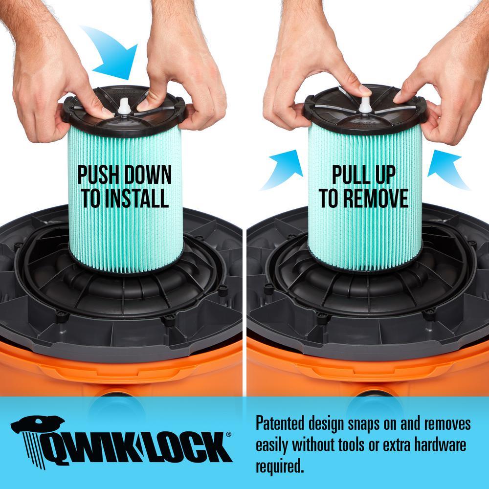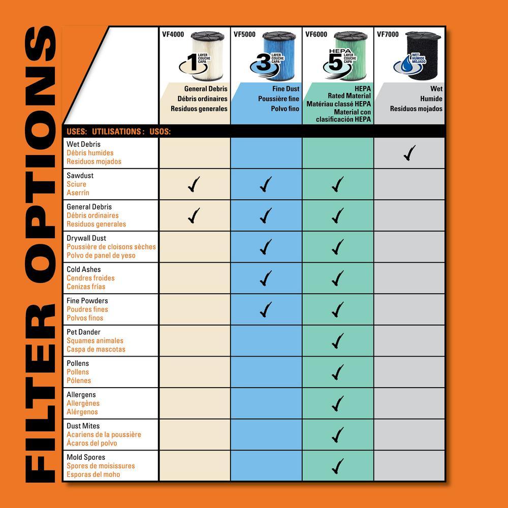 • HEPA-level filtration is achieved when the VF6000 HEPA media filter and VF3602 cyclonic dust bag are installed together in select RIDGID 12 Gal. to 16 Gal. wet dry vacs