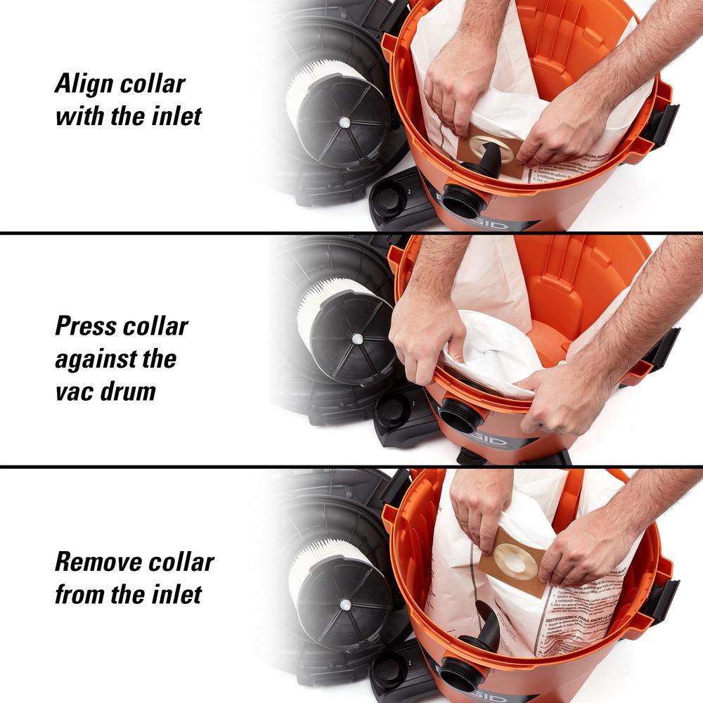 The RIDGID OSHA compatible kit with HEPA-media filter and cyclonic pre-separator dust bags includes 1 RIDGID VF6000 5-layer allergen filter and 2 RIDGID VF3602 premium cyclonic dust bags. When installed together (in select RIDGID vacs listed below), this kit is OSHA Silica Table 1 Compatible for certain dry dust collector control methods and HEPA-filtered vacuum control methods (1926.1153) within the limitations of their airflow performance. Included dust bags allow for cyclonic airflow, resulting in pre-separation and more equal distribution of fine particles and debris throughout the bag. Dust bag disposal is clean and easy with sealing collar feature. Included VF6000 filter is made from HEPA media. Compatible vacs listed below.