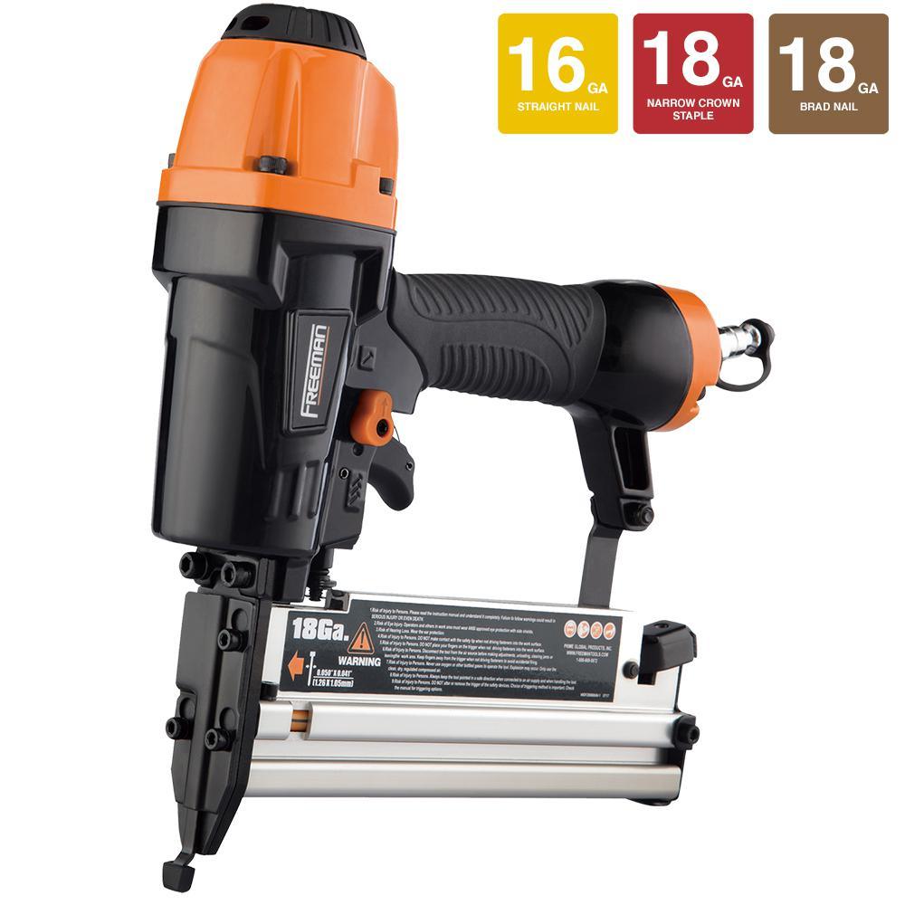 The versatile Freeman 3-in-1 Finish Nailer and Stapler combines the functionality of three pneumatic nailers into one tool. Compatible with 18-Gauge brad nails (5/8 in. to 2 in.), 18-Gauge narrow crown staples (5/8 in. to 1-5/8 in.) and 16-Gauge finish nails (3/4 in. to 2 in.), this nailer is the ideal all-around tool for installing crown molding, base boards, window casings, chair rails, furniture, cabinetry and other finish projects around the house. The magnesium construction and ergonomic handle make this nailer light enough for a full day of use without tiring out your arms, but is durable enough to handle tough projects. The 3-in-1 Nailer and Staplers magazine is designed for quick reloading and effortlessly switches between fastener types without any kind of adjustment, while the tool free depth adjust allows you to customize the driving depth for each project. Whether you prefer to work quickly using bump fire or want the accuracy of sequential fire mode, the select fire switch makes it easy to change firing modes. The nailer also features reload indicators, a 360° adjustable exhaust, a no-mar tip to protect your work surface and an air filter and anti-dust cap to keep the internal parts of your tool clean.