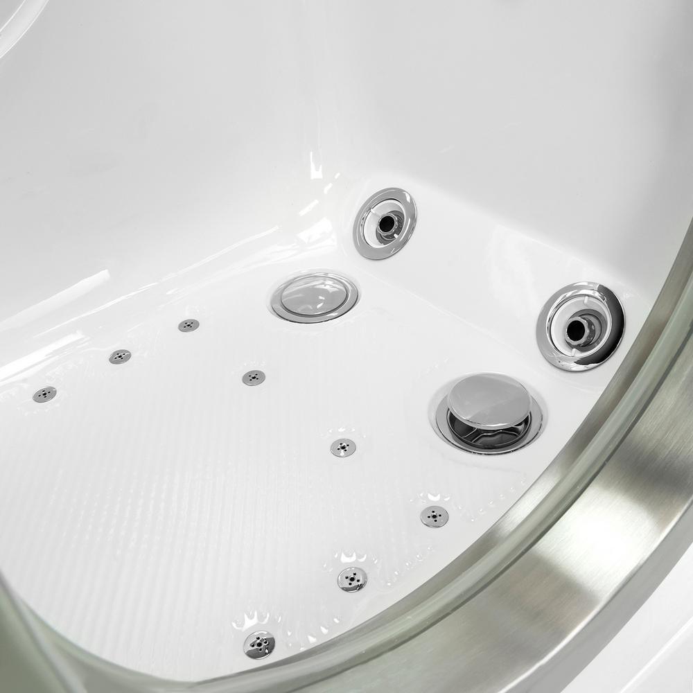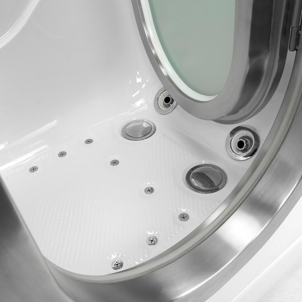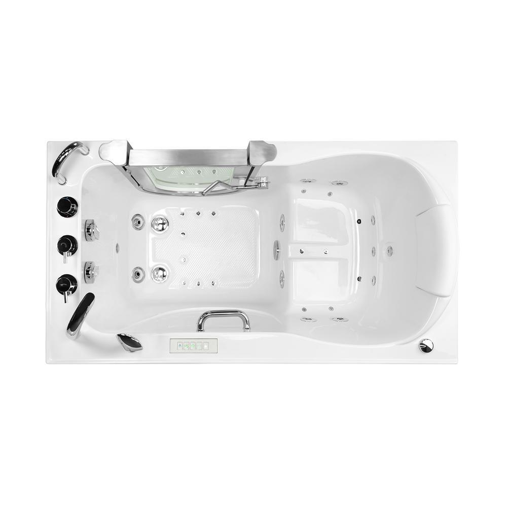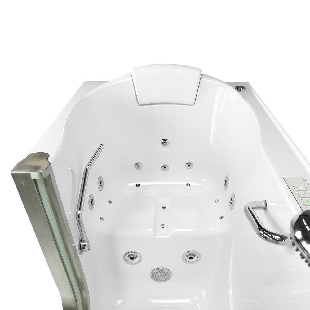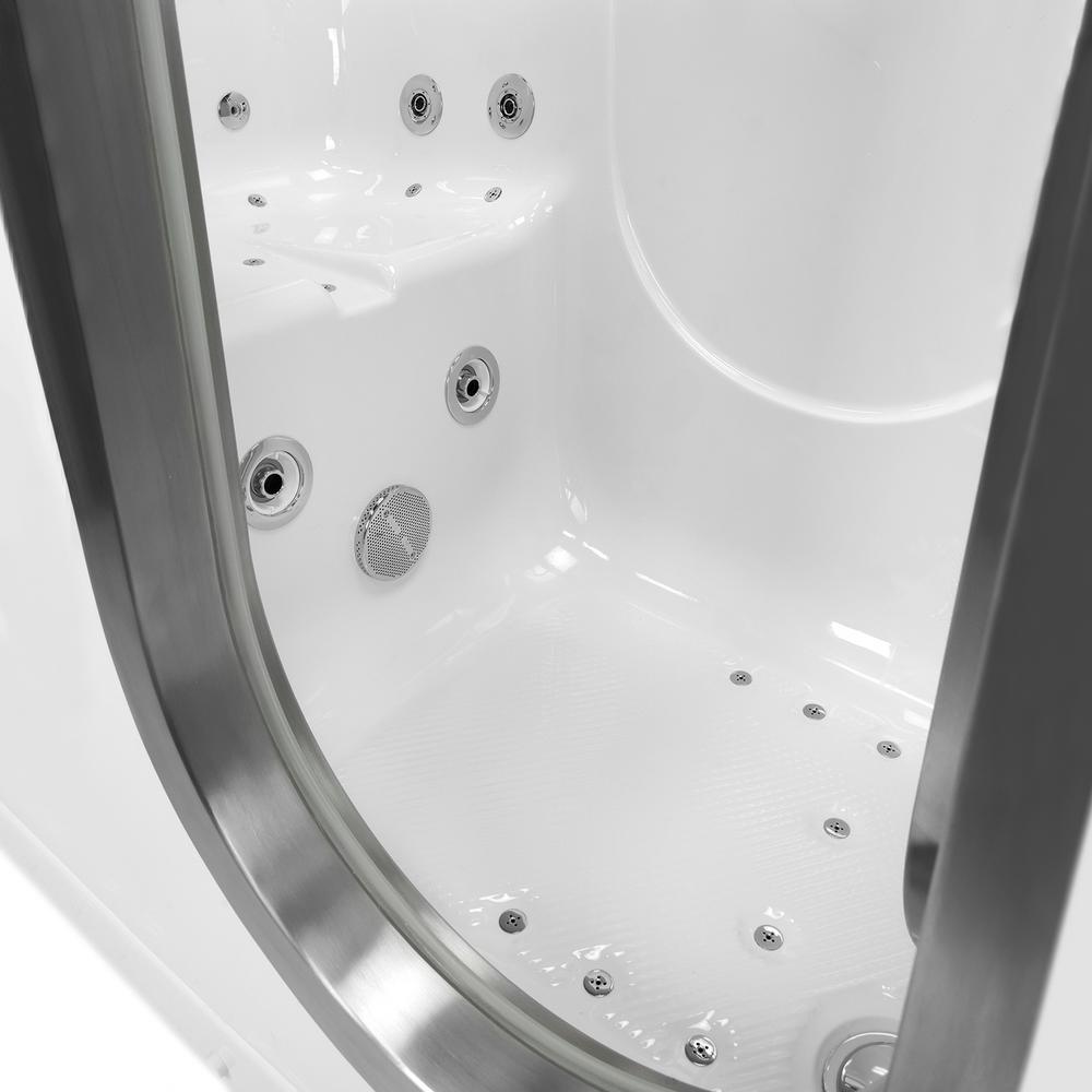 The Deluxe walk-in bathtub at 55 in. L, stretch out and give yourself more leg room, ideal for taller bathers. This walk-in tub offers a removable rubber backrest, 19.75 in. W seat, radiant heated seat and backrest, 8 adjustable and 4 fixed hydro massage jets with intensity air flow control and 10 therapeutic air massage jets with variable speed. Thermostatic Control faucet set with a designer spout, 2 diverters extension handles, a thermostatic control valve, and a pull-out hand-held shower mixer with 5 retractable stainless-steel hose. The thermostatic control valve is an anti-scald feature that prevents the water from shifting to unsafe temperatures. In addition, 2 dual drains minimize the amount of time you have to sit outside of the water. The drains are gravity driven and larger than a standard 1.5 in. drain. allowing drainage in approximately 80-seconds at ideal plumbing conditions. Ella acrylic walk in baths are constructed of the highest grade cast white acrylic, with an easy to clean gloss finish that is reinforced with fiberglass. The shell is supported by a stainless-steel frame and leveling legs for ease and durability during installation. The supporting frame and the Toe Kick Access Panel allow for simple above the floor drain installation, convenient access underneath and the ability to lower the threshold for easier step in access. All Inward Swing Tubs are assembled and jetted in Chicago with UL certified quality parts made by NuWhirl, a California company.