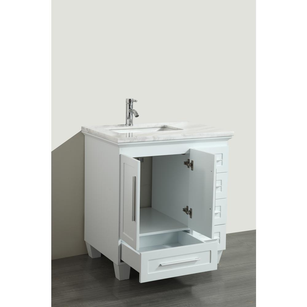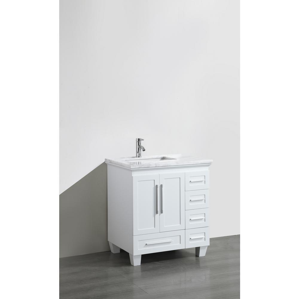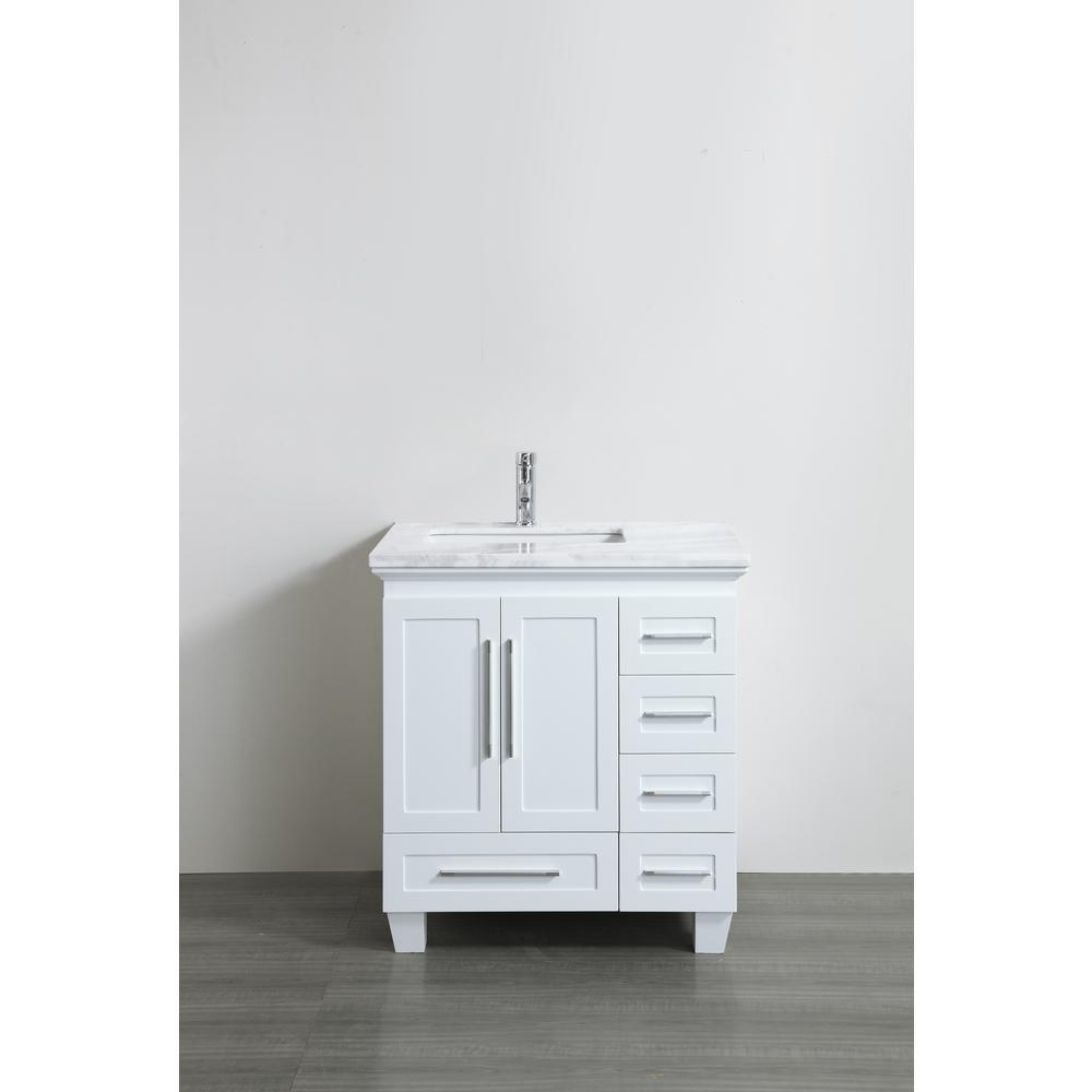 The Eviva Loon, a 30-inch bathroom vanity with long handles features a white porcelain under-mounted sink, a solid wood construct, a durable water-resistant polyurethane finish outside and water-resistant layer inside, Italian white Carrara marble top, soft closing drawers and doors, chrome hardware, and 1 pre-drilled hole for a faucet. Available in colors White, Grey, and Espresso.
