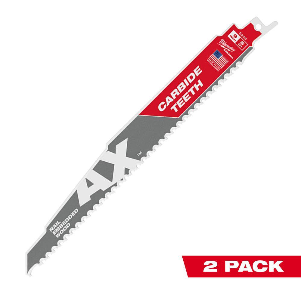 The 9 in. 5 TPI AX Carbide Teeth Demo Nail Embedded Wood Cutting SAWZALL Reciprocating Saw Blade (2-Pack) is designed by experts to provide the longest life and fastest cutting in the most challenging applications. With a 30X longer lifespan compared to standard bi-metal blades and 2X faster cutting than other carbide blades, this product features state-of-the-art carbide tipping technology for extreme durability. Its 5 TPI blade design allows for quick and aggressive cutting through nail-embedded wood and a variety of residential materials. Additionally, the blade includes Milwaukee's patented Nail Guard and Fang Tip features, which protect against wear and allow for faster plunging, respectively. Designed specifically for cordless reciprocating saws, this blade offers 25% more cuts per charge. Get the ultimate combination of carbide technology and tooth design for unrivaled performance and longevity. Each pack contains 2 blades.