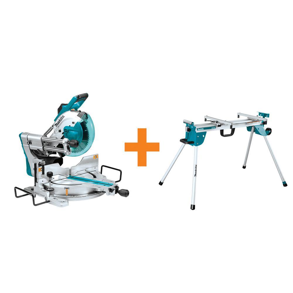 The Makita 10 Dual-Bevel Sliding Compound Miter Saw with Laser (model LS1019L) combines capacity, accuracy and efficient dust extraction in a more compact size, with a unique 2-Steel Rail Sliding System that offers a reduced footprint for operation flush against a wall. The innovative direct-drive gearbox and guard system is engineered for increased vertical cutting capacity of baseboard (5-1/4 in.) and crown molding (6-5/8 nested), the largest in its class. It will also crosscut a 4 in. x 12 in. at 90. The saw miters 0 to 60 left and right, with positive stops at 0, 15, 22.5, 31.6, 45 and 60 (left or right). The bevel lock is located in the front of the saw for easy access and quick adjustments from 0 to 48 (left and right). The saw is powered by a 15 AMP direct drive motor with soft start, a key point of difference. Direct drive enables smoother start-ups and consistent, constant power with no belts to slip or replace. The electric brake provides added convenience. In addition, the electronic speed control maintains constant speed under load for smoother, higher-quality cutting. Additional features include a high-quality 60T carbide-tipped blade, with a see-through blade guard system for greater visibility of the blade and line-of-cut. The built-in laser indicates the line-of-cut whether the blade is turning or not and offers micro-adjustments for precise left-of-blade or right-of-blade cutting. This Promotion also comes with a bonus WST06 Compact Folding Miter Saw Stand.