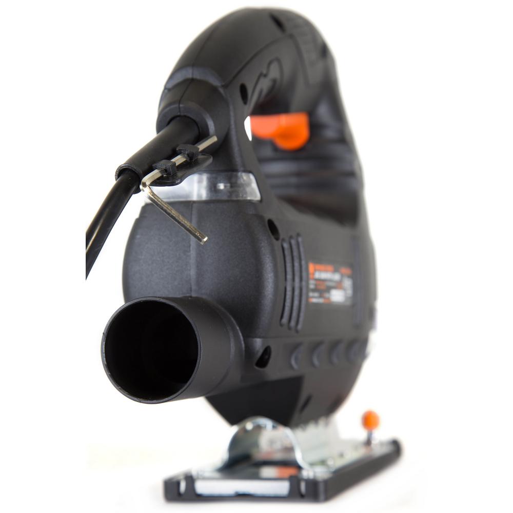 Remember when you had the ability to cut any shape you wanted all in the palm of your hand. The WEN 6.6 Amp Variable Speed Orbital Jig Saw glides through wood, metal, plastic and more, making any pattern or contour easy to achieve. The variable speed dial adjusts the stroke of the blade anywhere from 0 to 3,300 strokes per minute. Onboard laser keeps your line of cut right on target while the front mounted LED light helps illuminate your work piece. Attack wood up to 4-1/4 in. thick and metals up to 3/8 of an inch thick. The orbital selection knob helps adjust the strength of the blade to match the density of the cutting material. Simply turn the knob to change the stroke from vertical to orbital, creating a pendulum effect with the saws blade. Easily bevel the bottom footplate up to 45° in either direction for angled cuts in your work piece. The lock-on button temporarily holds the trigger in place to alleviate the stress of keeping the trigger engaged during long jobs. Make blade changes and installation faster than ever with the tool-free quick release chuck. The onboard tool storage system ensures that any necessary hex wrenches are always close while the rear-mounted dust port allows for attachment to the dust collection device of your choice. This package also includes a lock-on trigger switch, a beveling footplate, a non-marring shoe, a wood blade, a metal blade, and a parallel fence bracket, and a two-year warranty.
