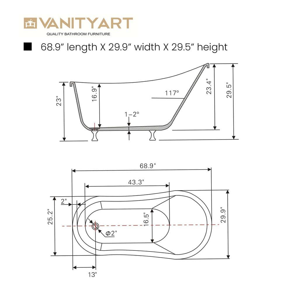 Experience ultimate relaxation with the Vanity Art Pantin 69-in. Acrylic Clawfoot Freestanding Bathtub in White. This sleek, contemporary tub provides a deep soaking experience, while its durable acrylic construction ensures long-lasting beauty and ease of maintenance.