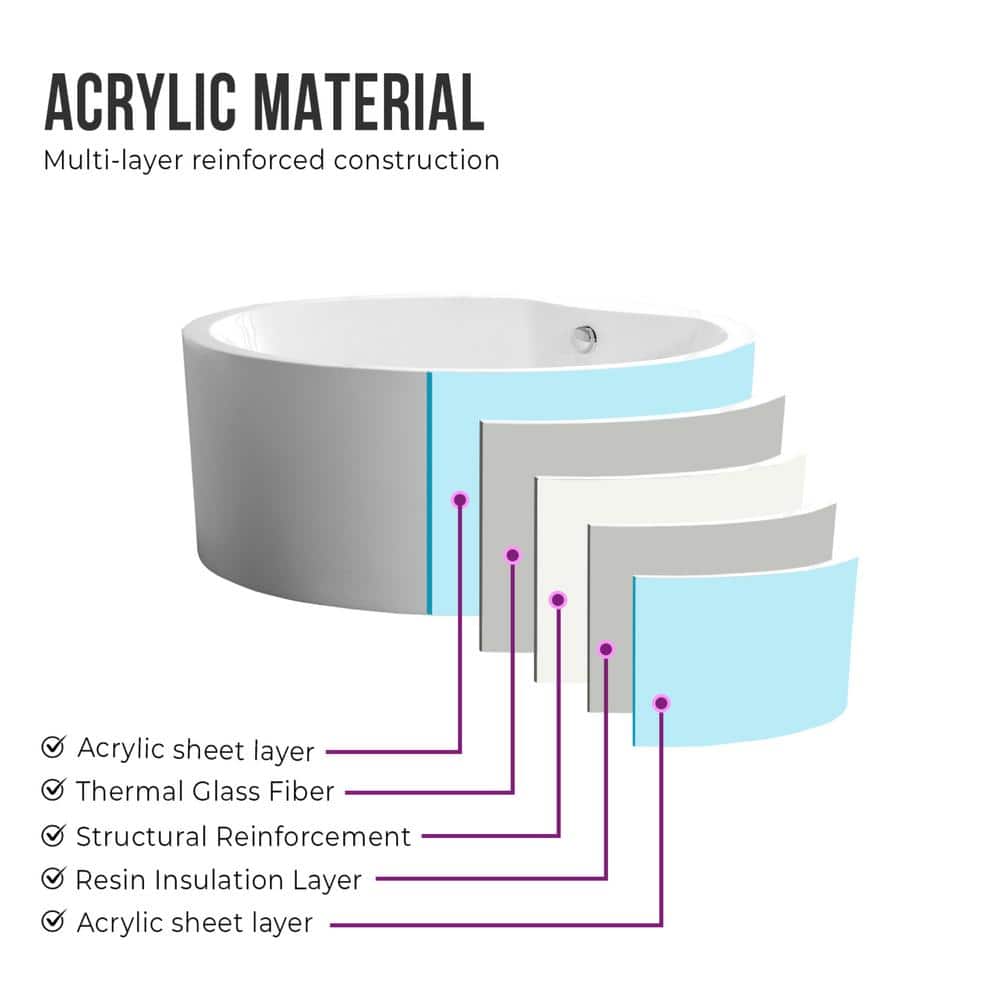 A: The bathtub is made from 100% high-quality acrylic, reinforced with fiberglass, which ensures its durability and strength.