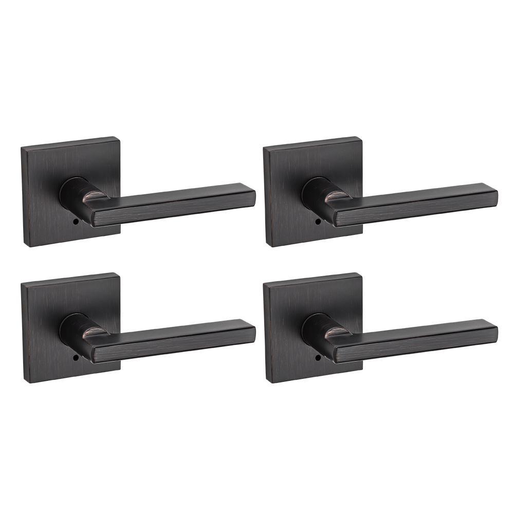 This reversible Kwikset Signature Series door lever (4-pack) mounts on right- and left-handed doors. It is ideal for interior doors requiring privacy locking function, such as bedroom or bathroom doors. An interior push button locks and unlocks the lever, which can also be unlocked with an included emergency key. Easy to install simply using a screwdriver, you can insert this metal lever in doors no thicker than 1-3/4 in. The latch features an adjustable backset and three interchangeable faceplates in rounded corner, square corner and in collar. Designed to emphasize the contemporary home, this sturdy door lever features an Matte Black finish to add a rich and warm accent to the application site.