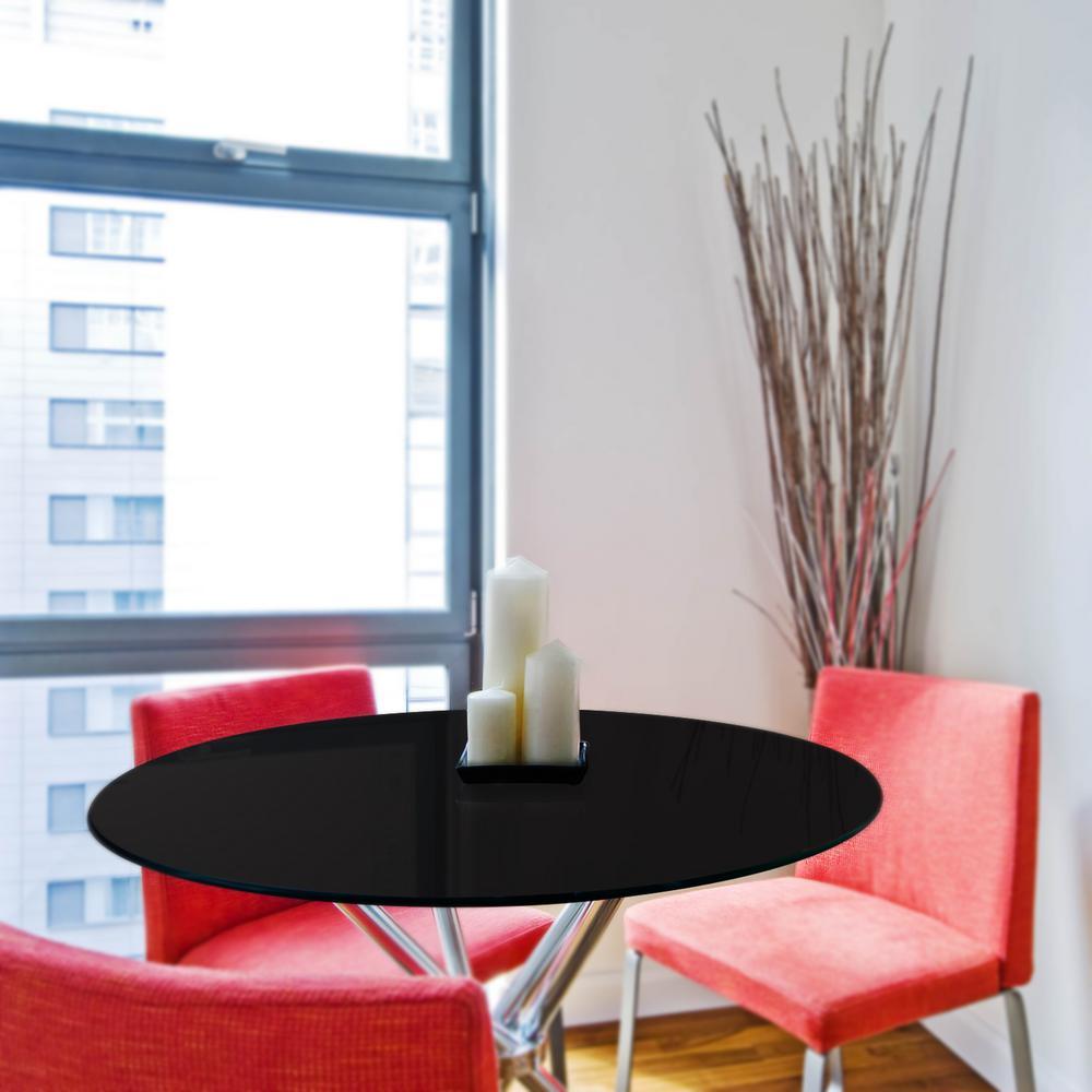 20" Inch round black colored glass table top can be used as a table top to protect a desk, patio table, surface of an existing table, coffee table and Bed Side table. Our colored glass is also back painted and this surface can get scratches or flakes if it came in contact with a rough surface. Available Sizes: 20, 22, 24, 26, 28, 30, 32, 34, 36, 38, 40. Available Colors: Red, Green, Blue, Black, and White. Tempered / Annealed: Tempered (toughened through a process of extreme heating and rapid cooling during the manufacturing process) glass is two or more times stronger than annealed glass. When broken, it shatters into many small fragments which prevent major injuries. Annealing is a process of slowly cooling glass to relieve internal stresses after it was formed. The process may be carried out in a temperature-controlled kiln. Glass which has not been annealed could be exposed to crack or shatter when subjected to a temperature change or mechanical shock. Annealing glass is important in order to make it more durable. Edgework: Flat polish This Glass table is available in the Flat polish finish, it is the standard edge produced by a straight line rectilinear or CNC machine and produces a fine polished flat edge suitable for all furniture glass and frameless toughened panels. Recommendations: Clear rubber bumper pads protect and cushion your glass top surfaces. Rubber bumper especially uses vacuum power to improve the pressure bearing capacity of the glass tabletop.