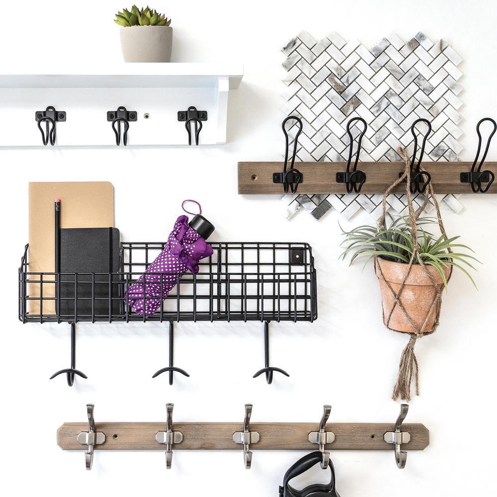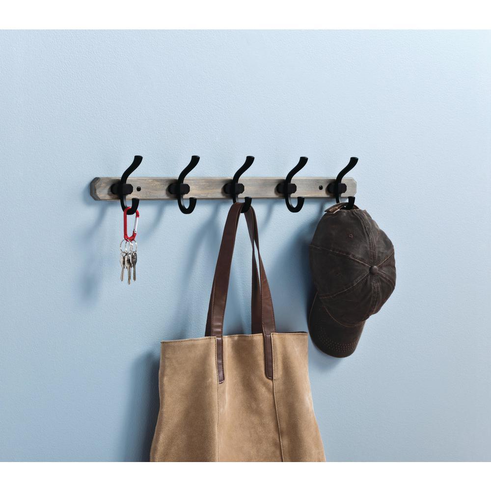 • Weathered graywash rack with dramatic flat black hooks combine for a charming rustic look