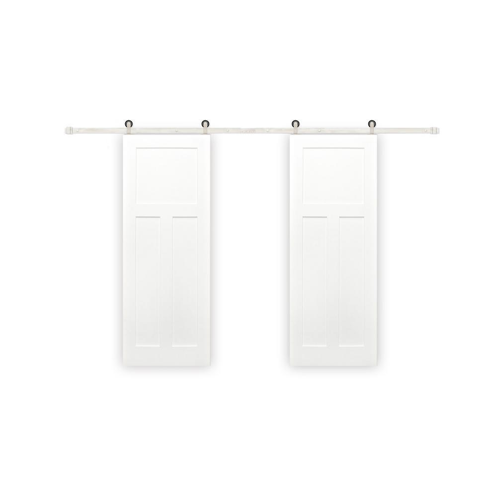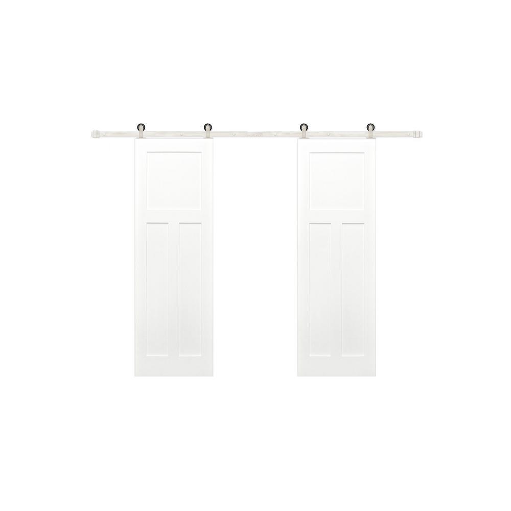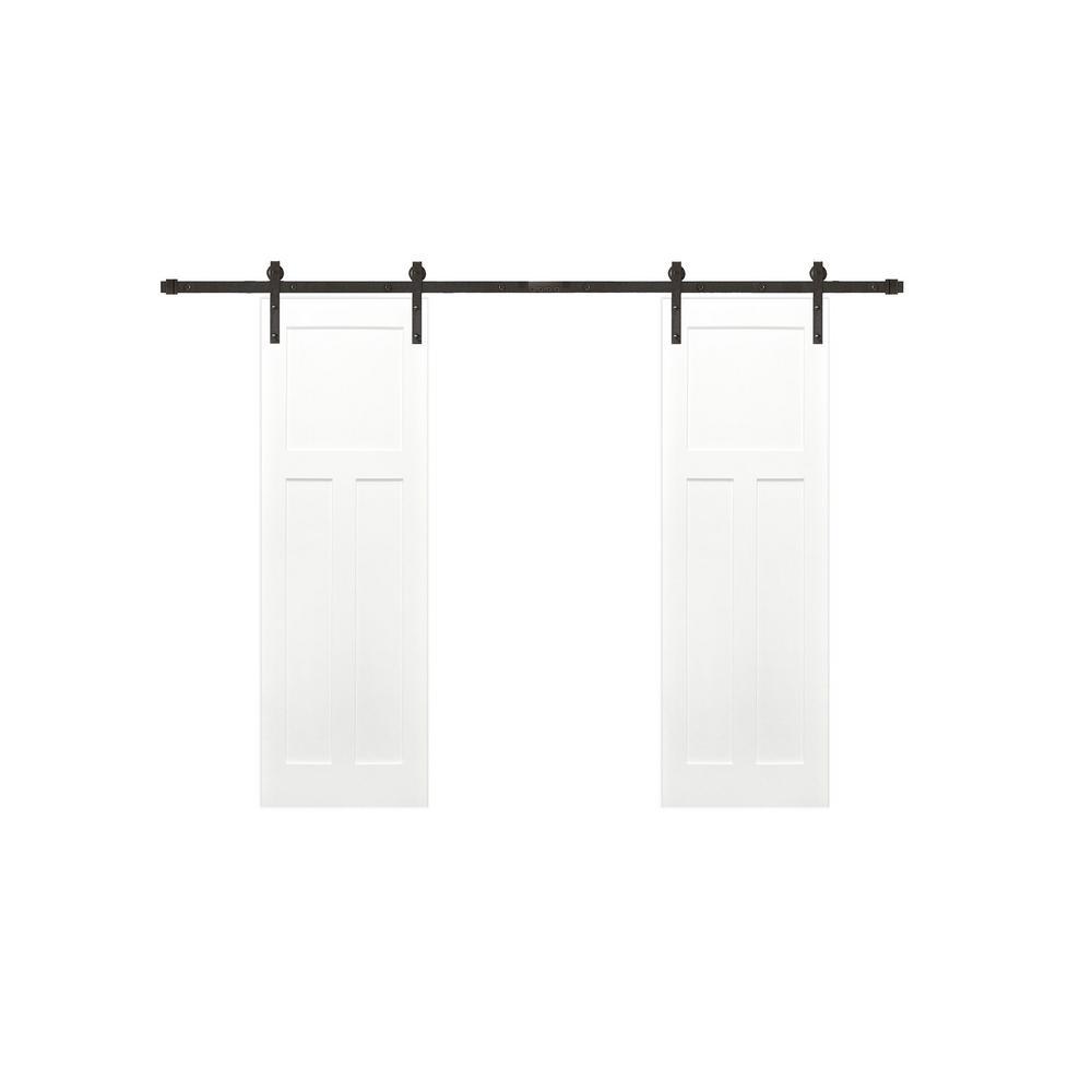 60 in. x 80 in. Bi-Parting Shaker 3-Panel Solid Core Primed Pine Sliding Barn Door with Bronze Hardware Kit