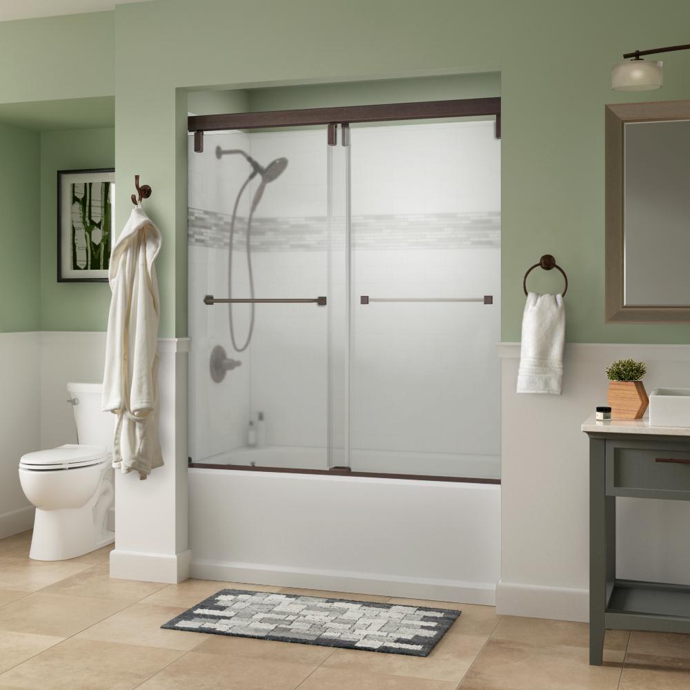 Whether you’re looking for a moderate DIY project or working on a bathroom remodel, upgrading your bathroom with a new sliding shower door is easy with the Delta 1-2-3 custom sliding shower door program. Delta’s custom glass shower door program offers 1000s of design combinations by choosing your glass shower panels, shower door track, and shower door handles to build a unique, personalized glass shower door. Clean, sleek and modern, the Mod bathtub door track in bronze features a soft close system paired with a reversible flat track, and minimal metal components, for the perfect balance of form and function. Make a statement with standard 1/4 in. ANSI certified tempered glass shower panels, featuring a smooth and completely frosted glass with a soft, satin-like look that is more private. The Everly sliding shower door handles in bronze feature two convenient towel bars for extra bathroom storage in a transitional design silhouette that beautifully combines contemporary and classic qualities.