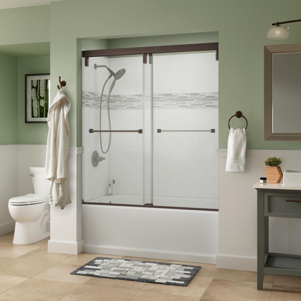 Whether you’re looking for a moderate DIY project or working on a bathroom remodel, upgrading your bathroom with a new sliding shower door is easy with the Delta 1-2-3 custom sliding shower door program. Delta’s custom glass shower door program offers 1000s of design combinations by choosing your glass shower panels, shower door track, and shower door handles to build a unique, personalized glass shower door. Clean, sleek and modern, the Mod bathtub door track in bronze features a soft close system paired with a reversible flat track, and minimal metal components, for the perfect balance of form and function. Show off your beautiful shower with standard 1/4 in. ANSI certified tempered glass shower panels, featuring Delta Spot Guard with a completely transparent look for a glass shower door that is both simple and elegant. The Everly sliding shower door handles in bronze feature two convenient towel bars for extra bathroom storage in a transitional design silhouette that beautifully combines contemporary and classic qualities.