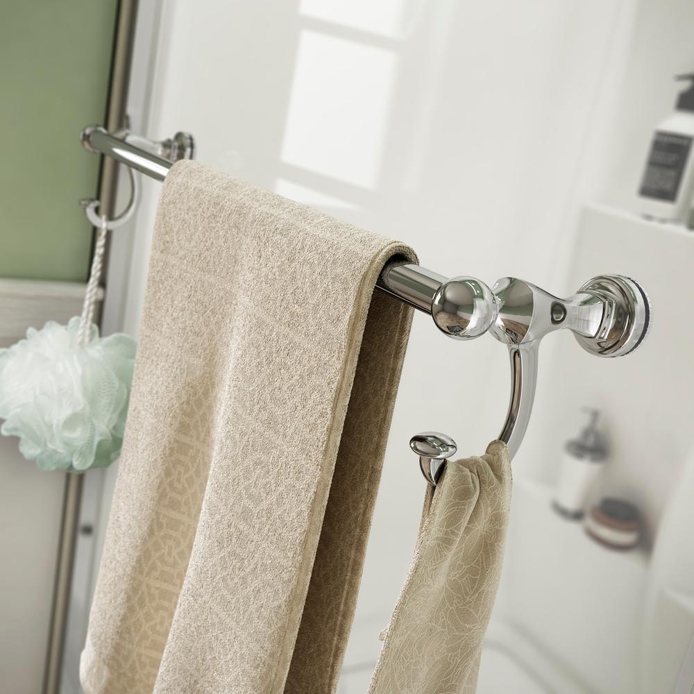 20 in. sliding shower door handle functions as a towel bar, providing handy storage space for a folded bath towel or two hand towels; interior panel knobs create a more spacious shower environment