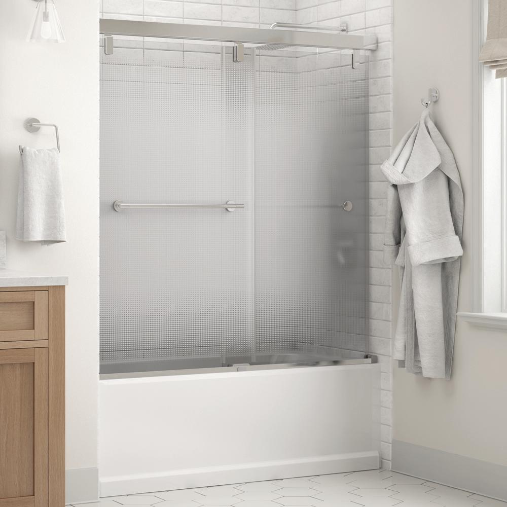 Whether you’re looking for a moderate DIY project or working on a bathroom remodel, upgrading your bathroom with a new sliding shower door is easy with the Delta 1-2-3 custom sliding shower door program. Delta’s custom glass shower door program offers 1000s of design combinations by choosing your glass shower panels, shower door track, and shower door handles to build a unique, personalized glass shower door. Clean, sleek and modern, the Mod bathtub door track in nickel features a soft close system paired with a reversible flat track, and minimal metal components, for the perfect balance of form and function. Make a statement with standard 1/4 in. ANSI certified tempered glass shower panels, featuring a mainly smooth and frosted surface with a traditional design element that’s luxurious and relaxing. The Everly sliding shower door handles in nickel feature two convenient towel bars for extra bathroom storage in a transitional design silhouette that beautifully combines contemporary and classic qualities.