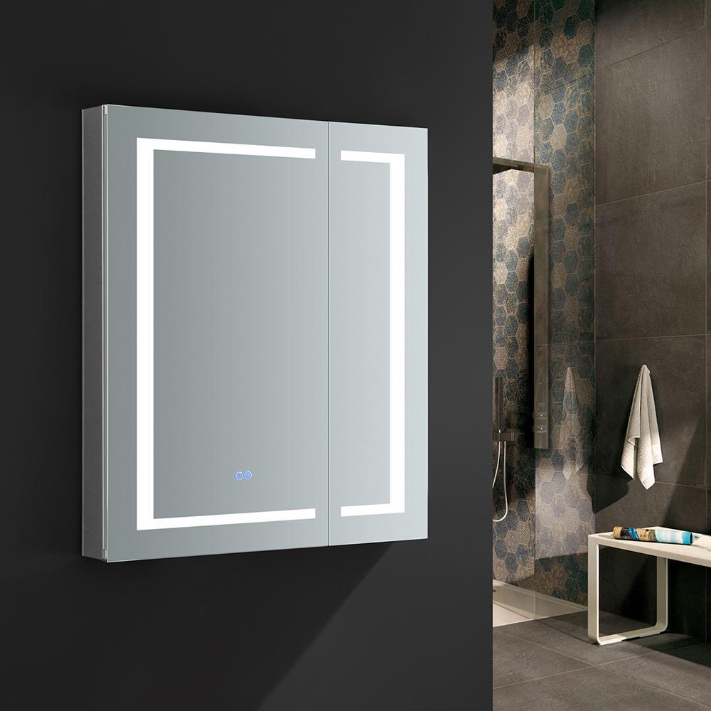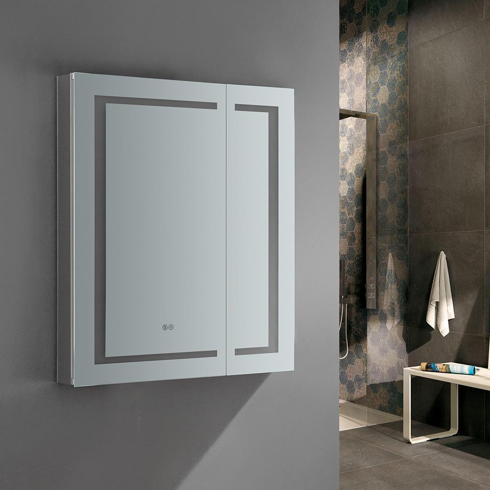Spazio 30 in. W x 36 in. H Recessed or Surface Mount Medicine Cabinet with LED Lighting and Mirror Defogger