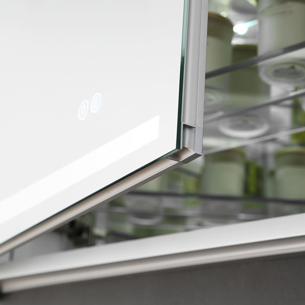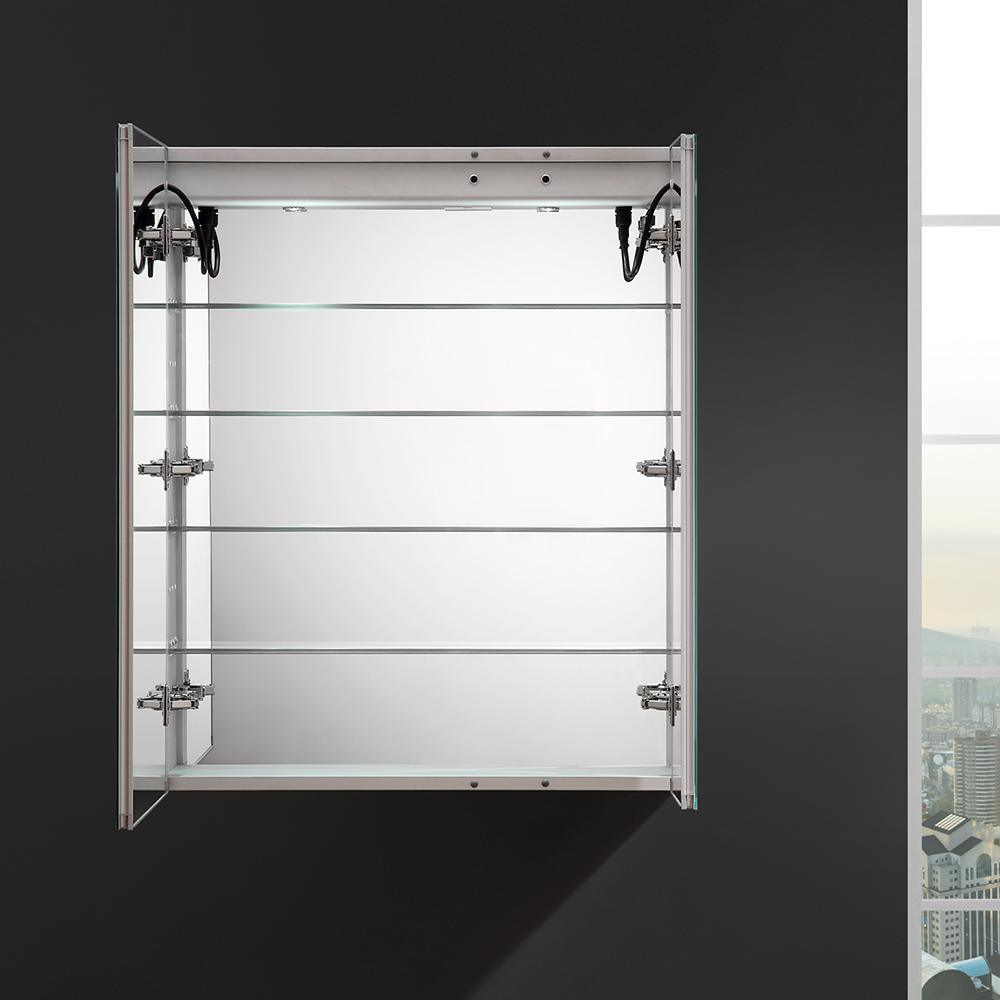 The Fresca Bathroom Medicine Cabinet comes with everything you need to create an elegant and modern bathroom, with every convenience right in front of you. On the outside, its a sophisticated mirrored medicine cabinet with a built-in dimmable surface LED task light which creates an illuminated frame within the mirror. It also has a defogger feature. Inside, there's an LED light and a handy electrical/USB outlet combo for an electric shaver, toothbrush or other essentials. The interior features 4 adjustable glass shelves and a mirrored back wall. The double-sided mirrored doors swing 170°s on soft-close BLUM hinges. Measuring 30 in. W x 36 in. H x 5 in. D, this medicine cabinet is available in several sizes.