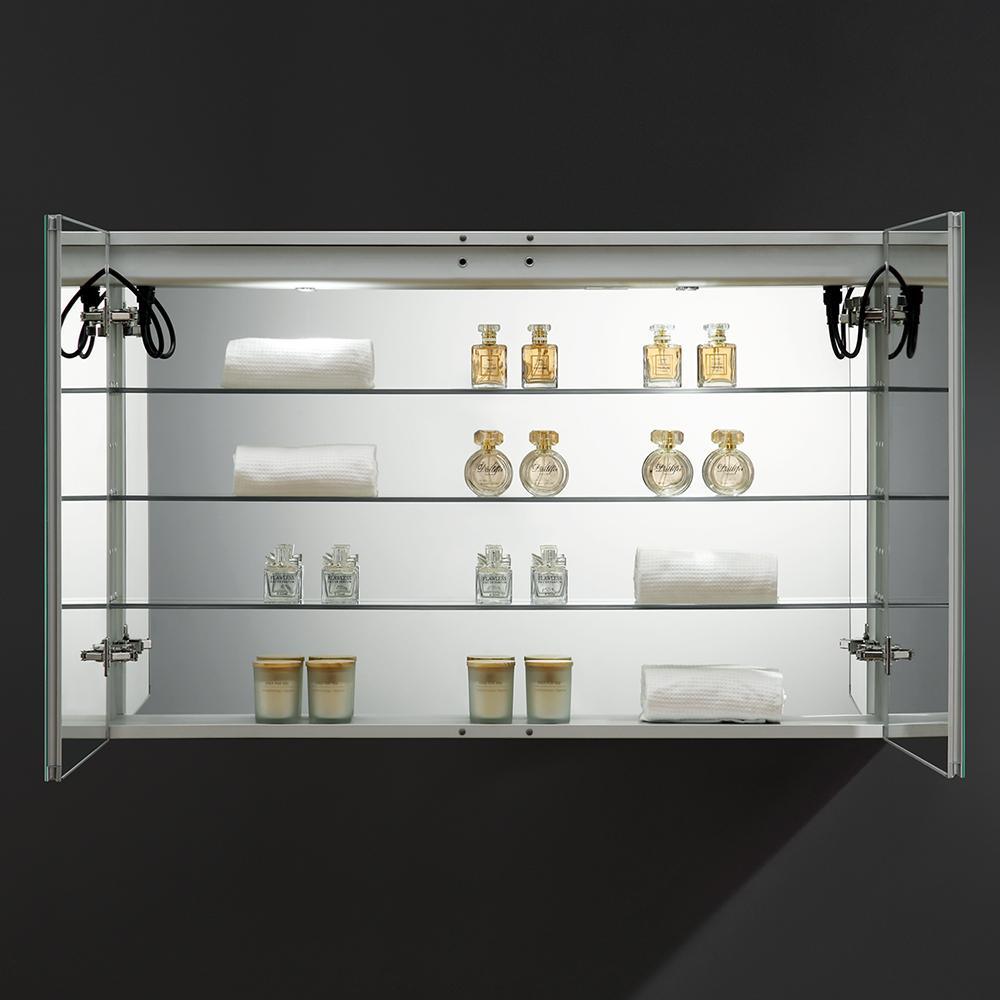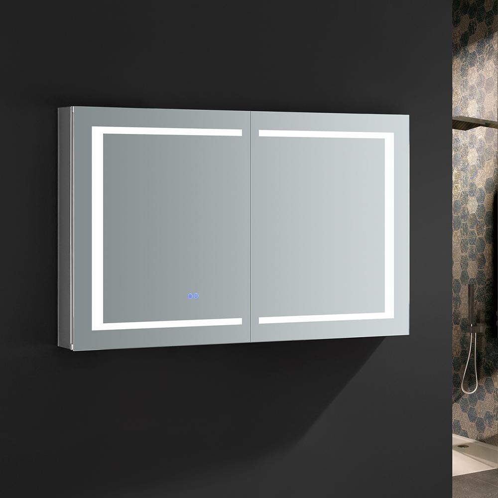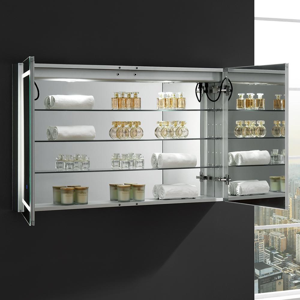 The Fresca Bathroom Medicine Cabinet comes with everything you need to create an elegant and modern bathroom, with every convenience right in front of you. On the outside, its a sophisticated mirrored medicine cabinet with a built-in dimmable surface LED task light which creates an illuminated frame within the mirror. It also has a defogger feature. Inside, there's an LED light and a handy electrical/USB outlet combo for an electric shaver, toothbrush or other essentials. The interior features 3 adjustable glass shelves and a mirrored back wall. The double-sided mirrored doors swing 170°s on soft-close BLUM hinges. Measuring 48 in. W x 30 in. H x 5 in. D, this medicine cabinet is available in several sizes.