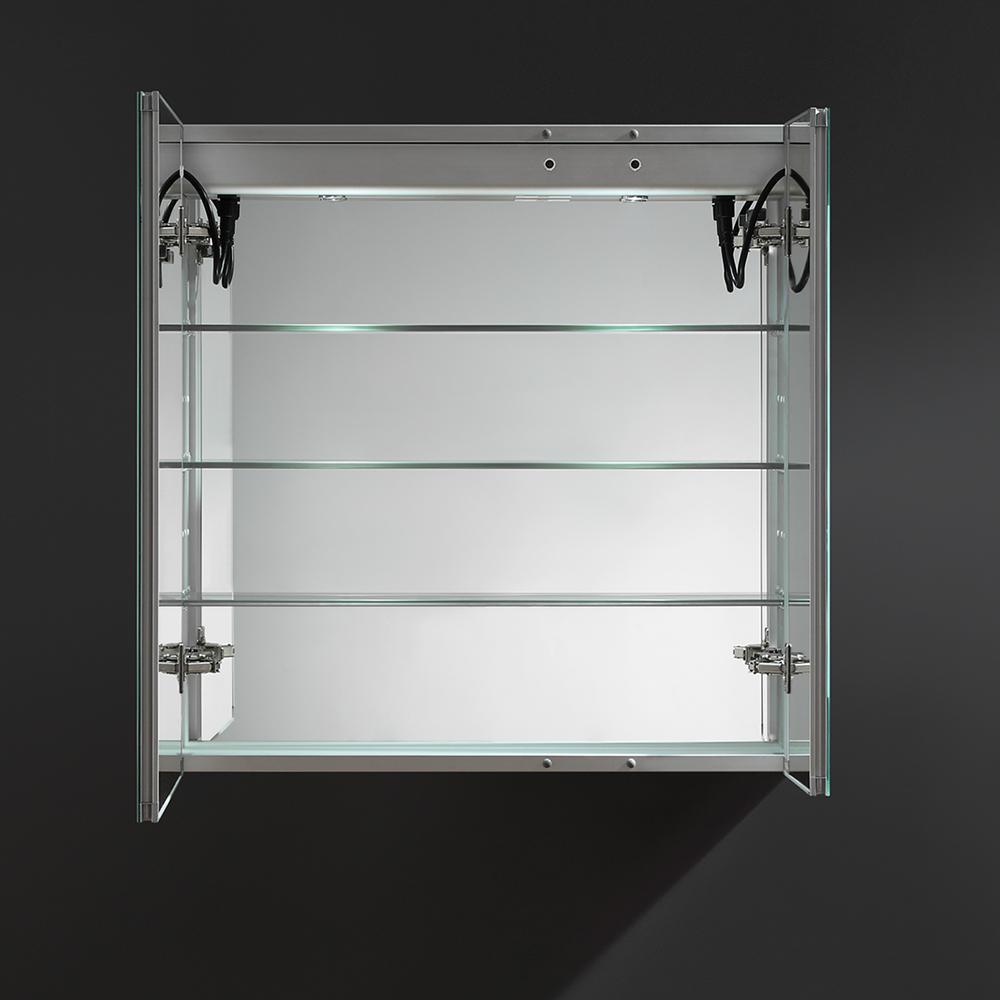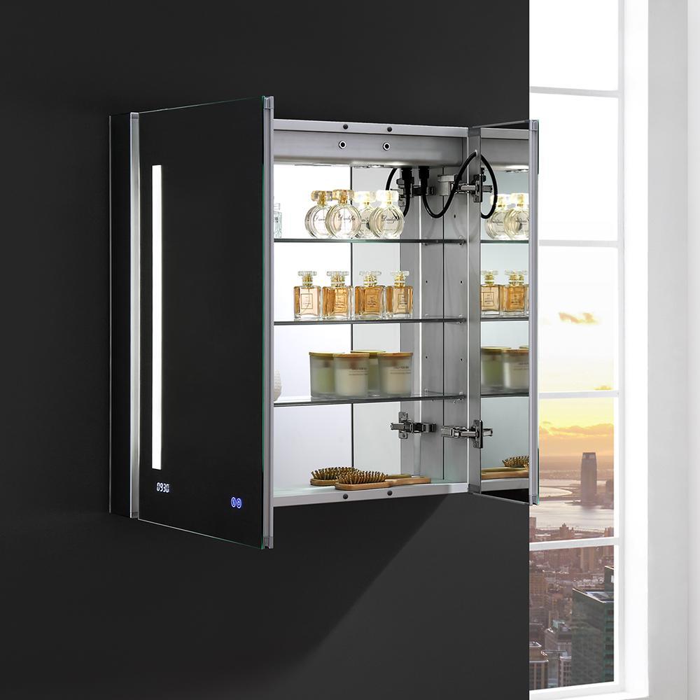 The Fresca Bathroom Medicine Cabinet comes with everything you need to create an elegant and modern bathroom, with every convenience right in front of you. On the outside, its a sophisticated frameless mirrored medicine cabinet with a built-in dimmable surface LED task light and a defogger feature. Inside, there's an LED light and a handy electrical/USB outlet combo for an electric shaver, toothbrush or other essentials. The interior features 3 adjustable glass shelves and a mirrored back wall. The double-sided mirrored doors swing 170°s on soft-close BLUM hinges. In addition to all of these great features, this particular style is equipped with a digital clock option. Measuring 30 in. W x 30 in. H x 5 in. D, this medicine cabinet is available in several sizes.
