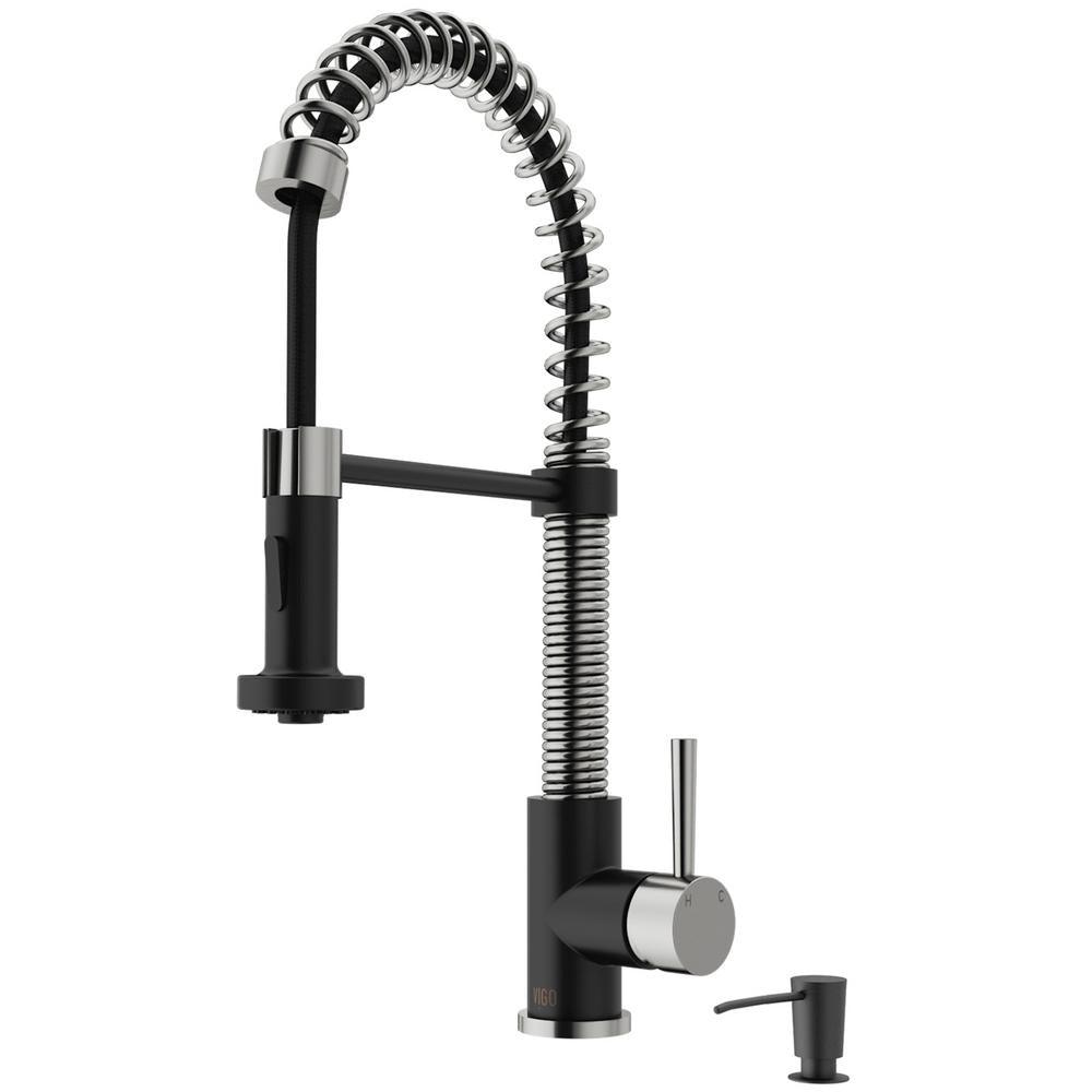 The pull-down, dual action spray head on the VIGO Edison Pull-Down Spray Kitchen Faucet allows for your choice of aerated flow or powerful spray for all your modern kitchen needs. The 360° swivel spout extends up to 30 inches, and its spiral details and solid brass construction make it a highly functional and beautiful statement piece. A matching matte black soap dispenser introduces added convenience to your kitchen remodel.