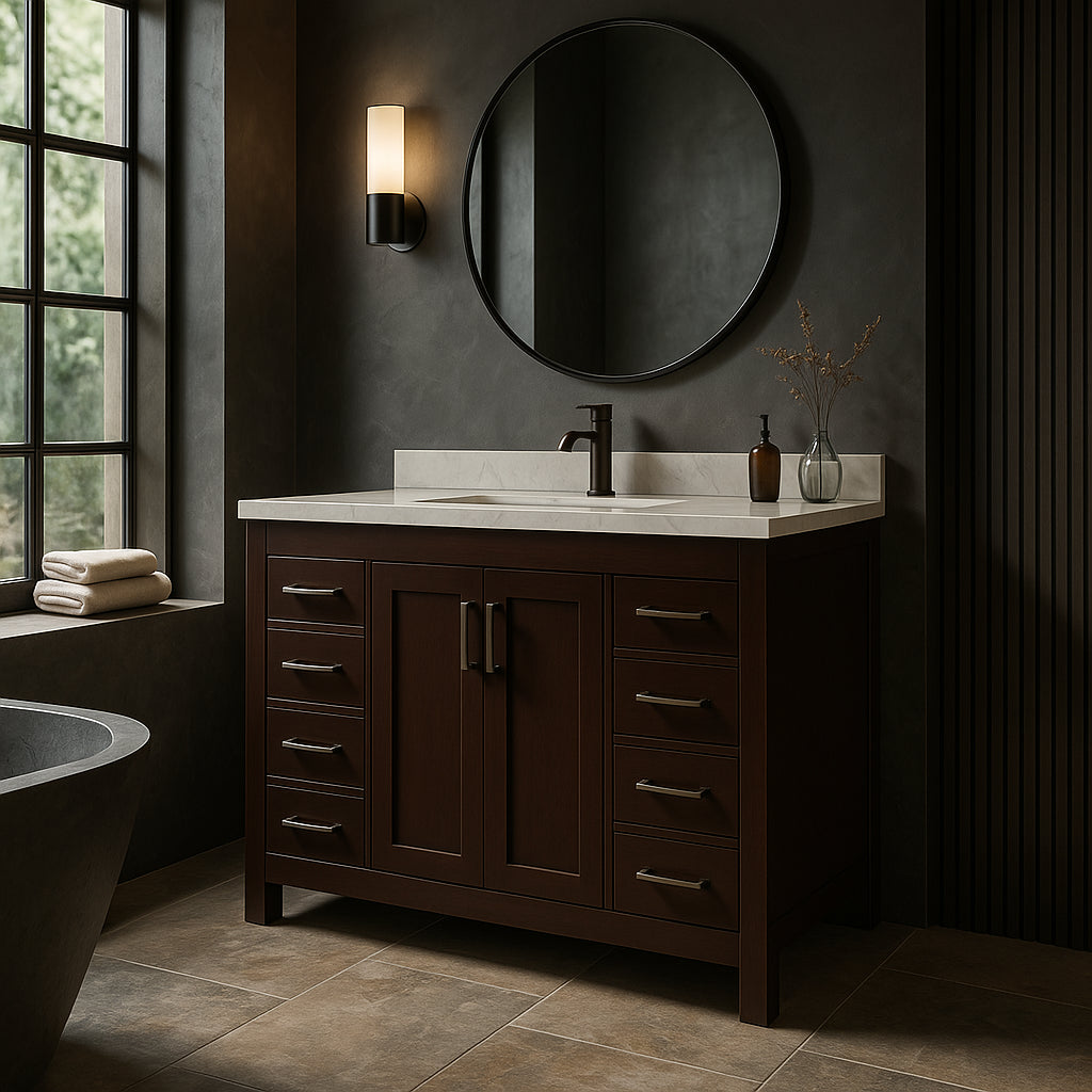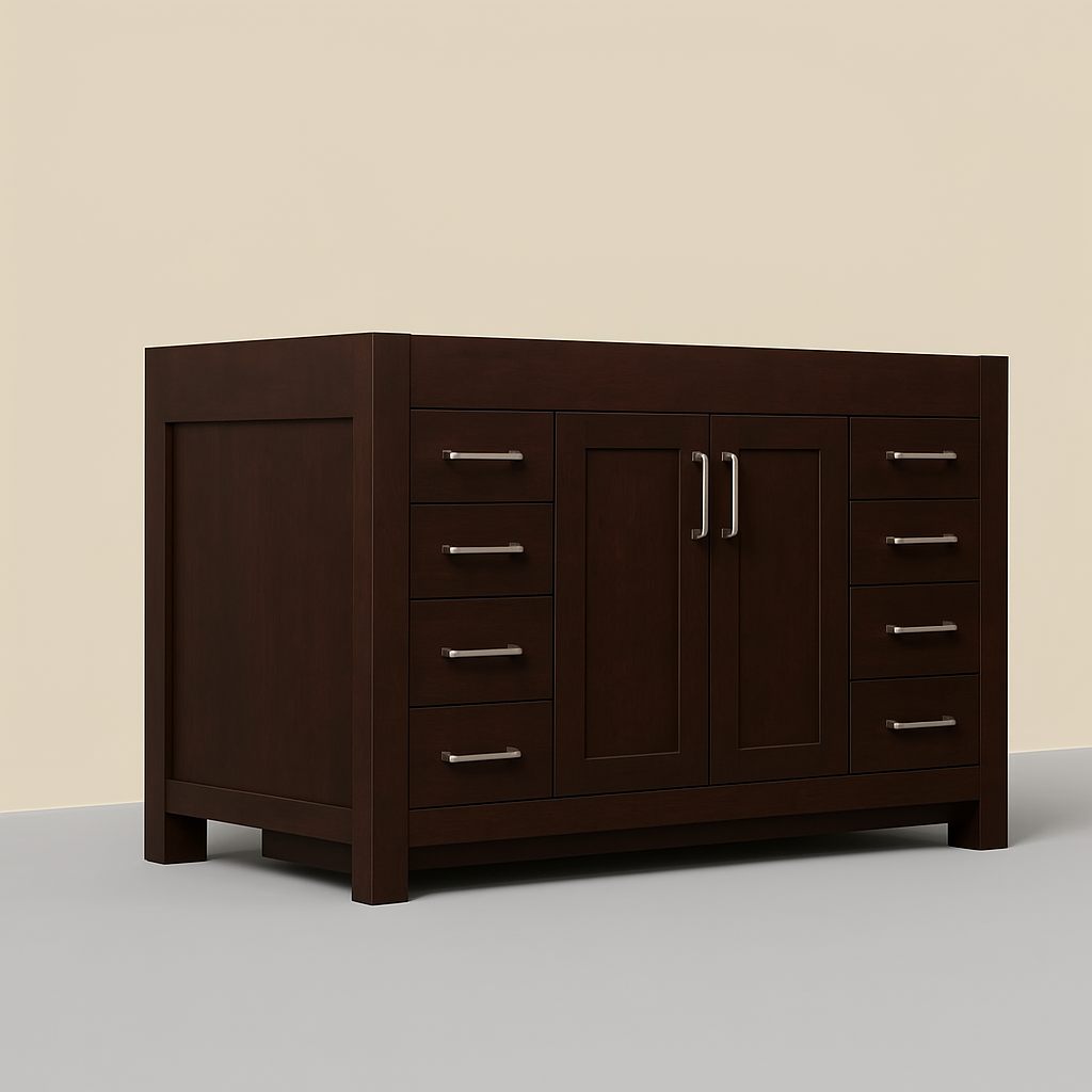 The Westcourt 48-inch vanity cabinet combines modern design with practical storage solutions. Featuring shaker-style doors, flat panel drawers, and a warm chocolate finish, this cabinet is perfect for enhancing any bathroom space.