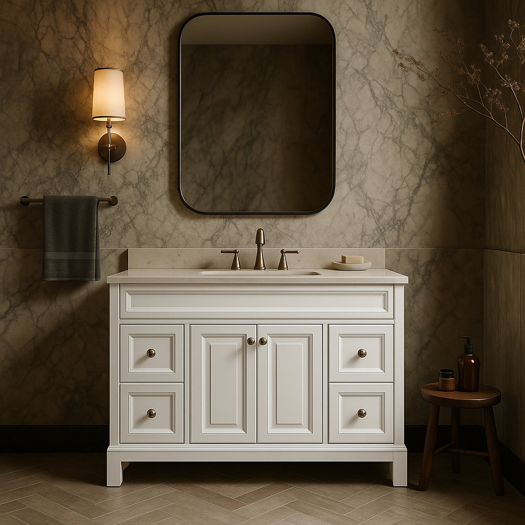The Brinkhill 48-Inch Bathroom Vanity Cabinet combines timeless design with practical storage solutions. Featuring a white finish, soft-close doors, and polished nickel hardware, it is perfect for enhancing any bathroom space.