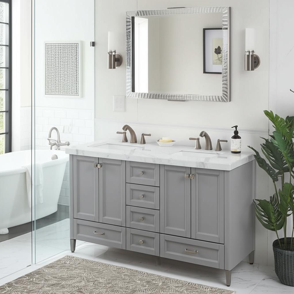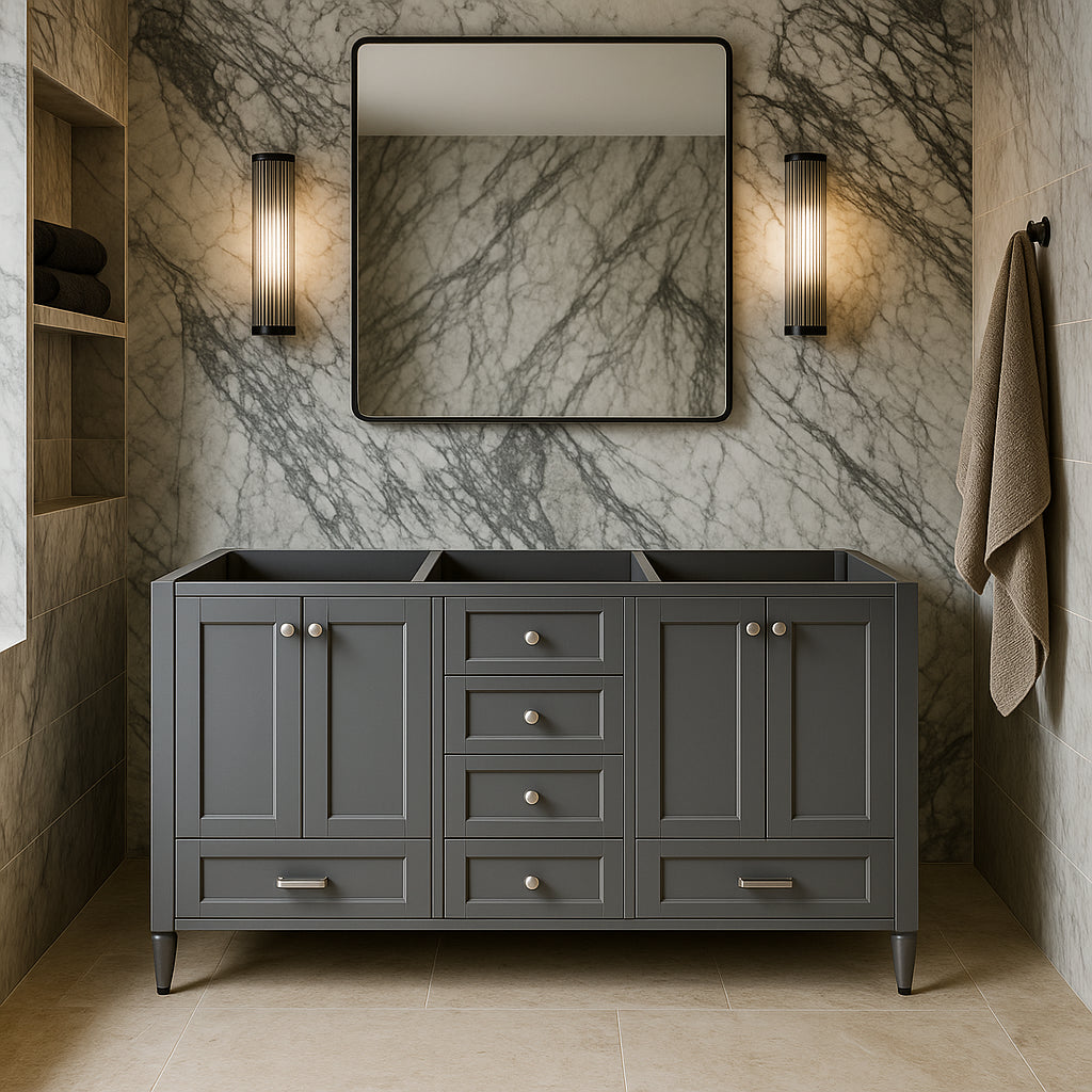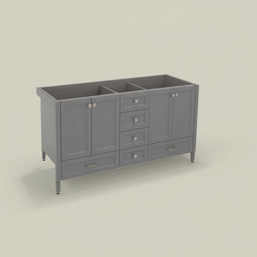 The Claxby 60-Inch Bathroom Vanity Cabinet in Sterling Gray combines elegant design with practical storage solutions. Featuring soft-close doors, adjustable hinges, and polished nickel hardware, this vanity is perfect for modern bathrooms.