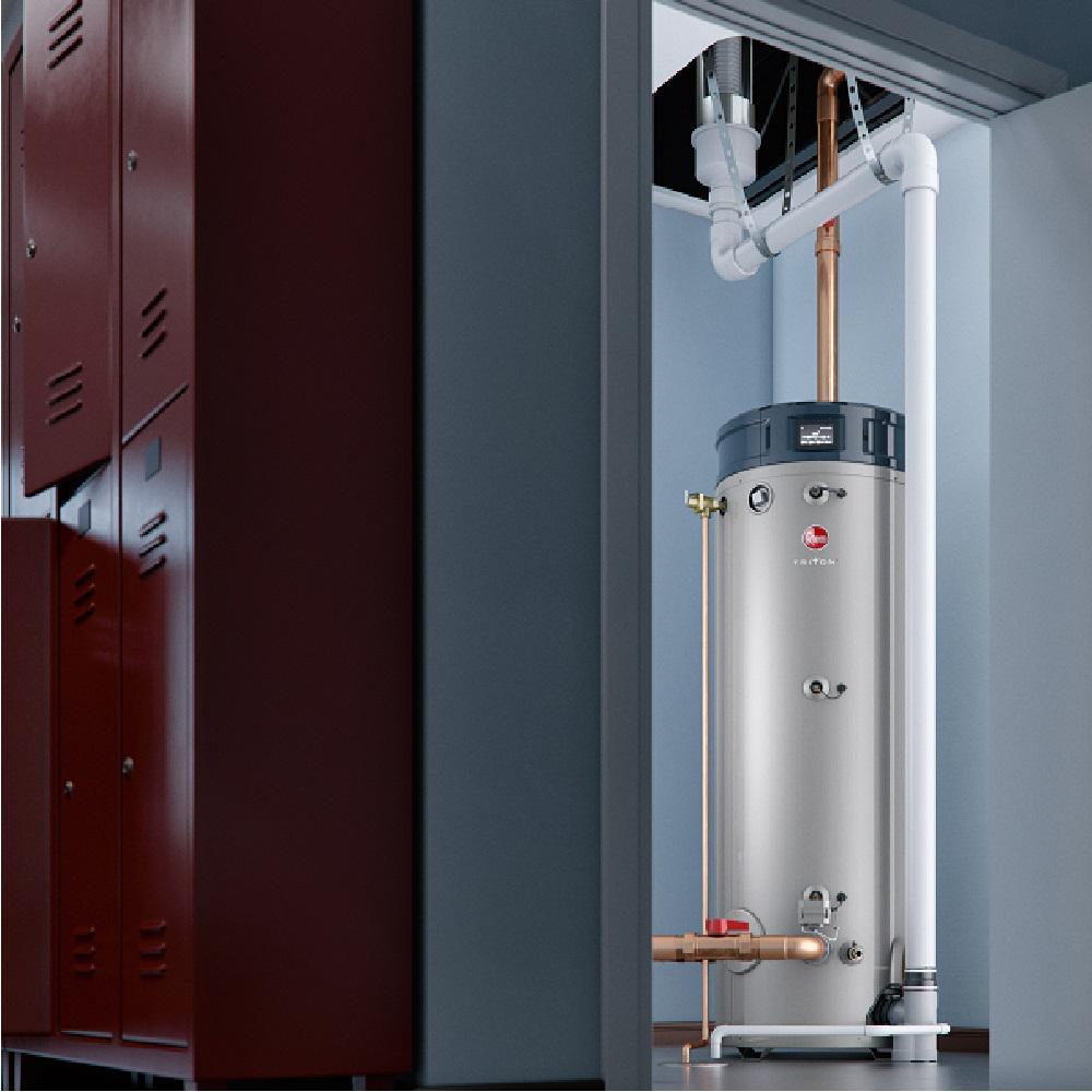 The Rheem Triton Commercial Water Heater is the most intelligent high efficiency commercial gas water heater on the market and features a universal design so you can easily have your existing water heater replaced regardless of brand. It's designed to help protect your business with features like LeakSense. Plus, easy-to -own features like preventive maintenance alerts mean you can focus on your business without worrying about your water heater. Enjoy built-in intelligence, installation versatility, extended tank life, integrated Wi-Fi and the ability to detect and prevent water heater problems all with Rheem Triton.