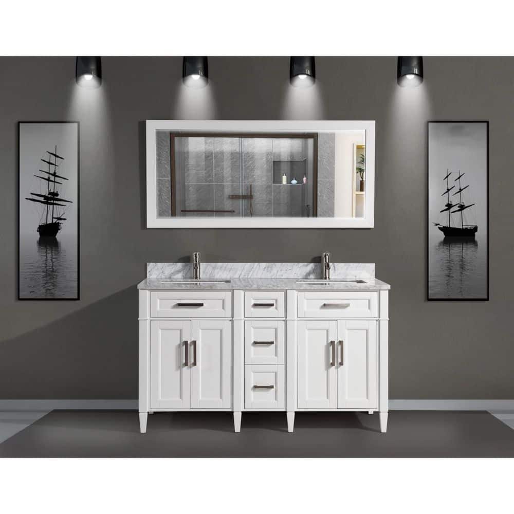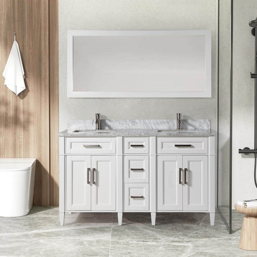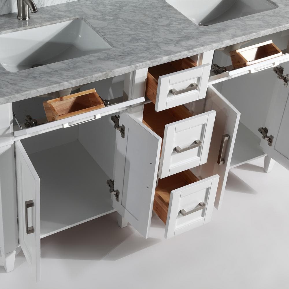The Vanity Art Savona 60" Bath Vanity Set brings sophistication and practicality to your bathroom with its elegant Carrara marble top and spacious design. This fully assembled vanity includes soft-closing doors and drawers, a sleek white finish, and a coordinating mirror, making it a perfect turnkey solution for any modern bath.